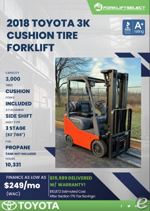 Equipment Description: TOYOTA 3 000LB 3 STAGE SIDE SHIFT PROPANE CUSHION RETAIL READY