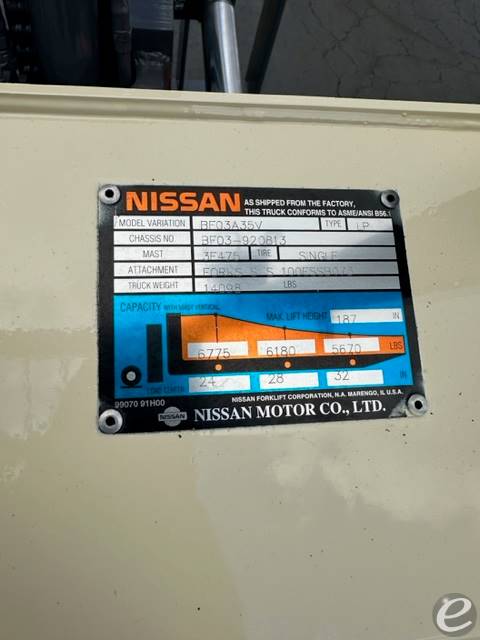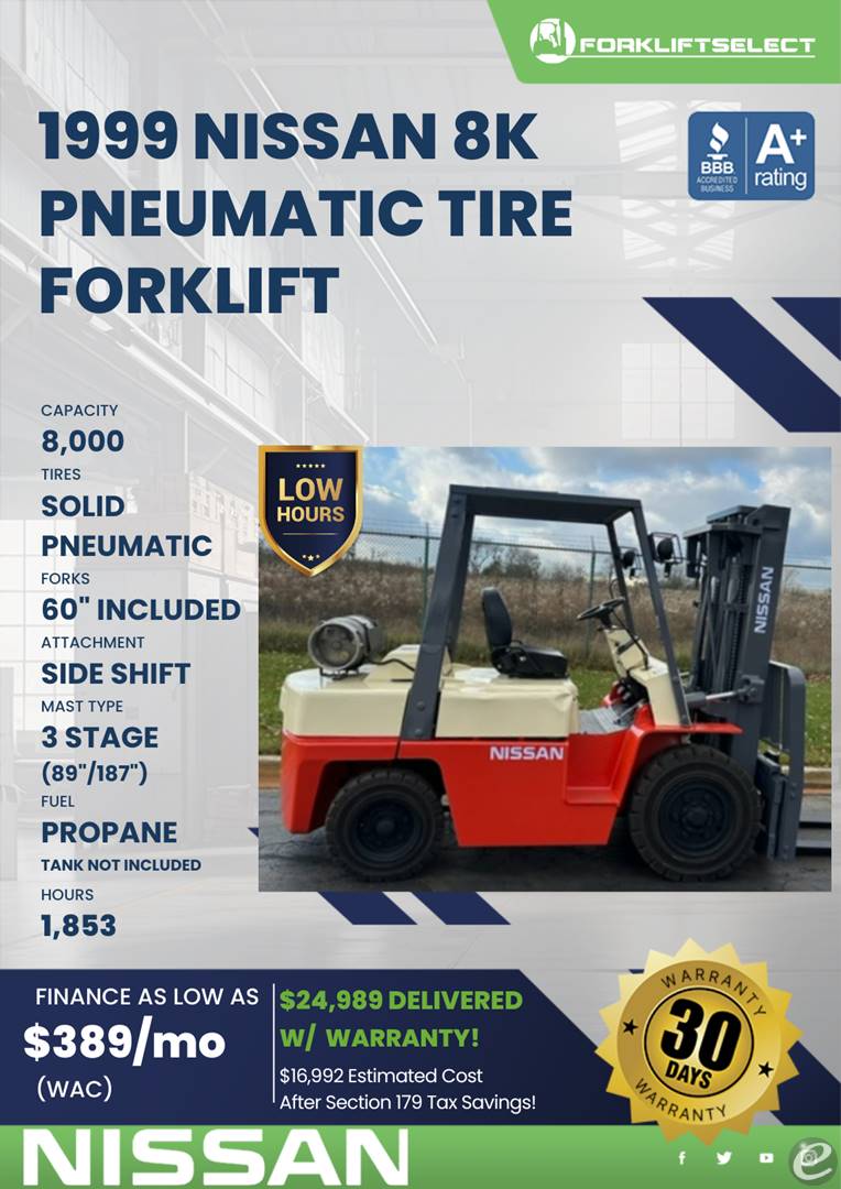 Equipment Description: NISSAN 8K 3 STAGE MAST 87 189 SIDE SHIFT PROPANE TANK NOT INCLUDED NEW SOLID PNEUMATICS