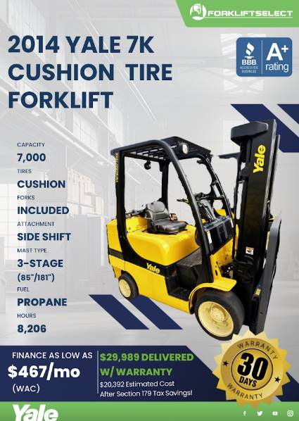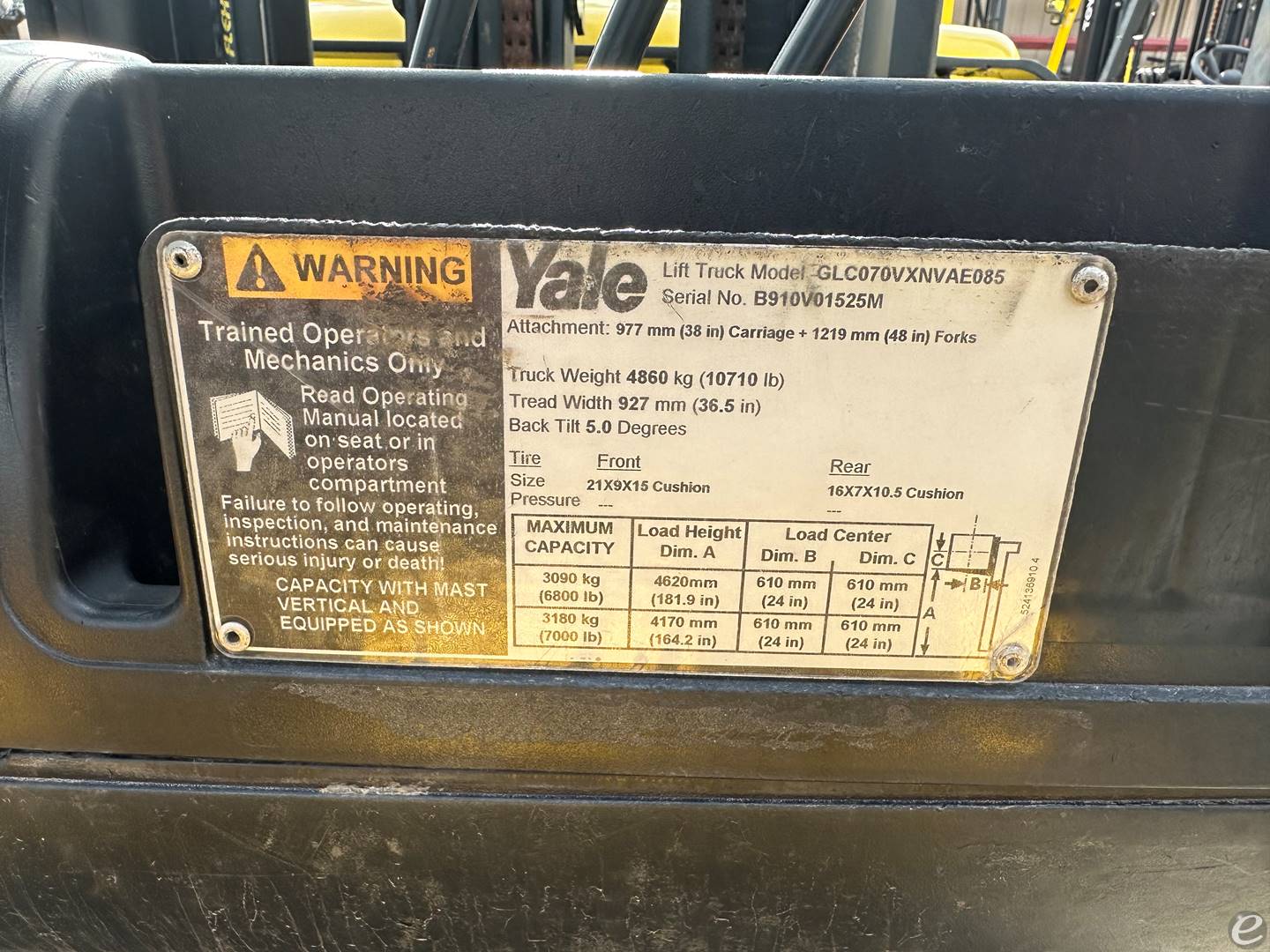 Description: YEAR 2014 MANUFACTURER Yale MODEL GLC070VX CAPACITY 7000 FUEL LP Gas SUBCATEGORY Cushion Tire 4 Wheel Sit Down Indoor Warehouse MAST TYPE Three Stage MAST SPEC 181 SIDE SHIFTER Yes CONDITION Used LOCATION Arizona 85120 Description