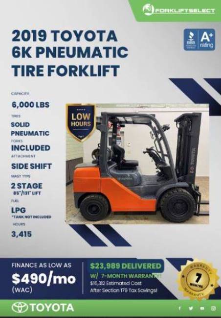 Description: ONLY 3415 HRS 2019 TOYOTA 6K 2STG FULL FREE LPG SOLIDS