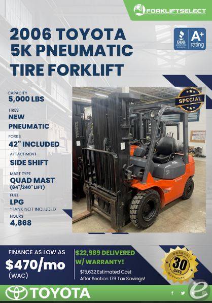Equipment Description: SOLD TOYOTACAPACITY QUAD MAST 240 SIDE SHIFT ONLYHOURS NEW SOLID PNEUMATICS