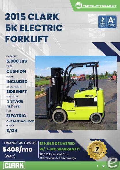 Equipment Description: Model Number ECX25 Manufacturer Clark Type Forklift Subtype Electric 4 Wheel Sit Down Power Source Electric Operator Type Sit Down Load Capacity lbs Wheel Configuration 4 Wheel Overall Length inches Overall Width 43 inches Overall Height top of the overhead guard 87 inches Wheelbase 61 inches Ground Clearance 3 5 inches Tires Front Tires 18 x 7-8 inches Rear Tires 15 xinches Travel Speed mph Lift Speed 60 ft min loaded Lowering Speed 90 ft min loaded Battery Voltage 36V Battery Capacity Ah Steering System Hydraulic Power Steering Service Brake Hydraulic Drum Parking Brake Hand Operated Standard Fork Length Varies Fork Width 4 inches Fork Thickness 1 5 inches