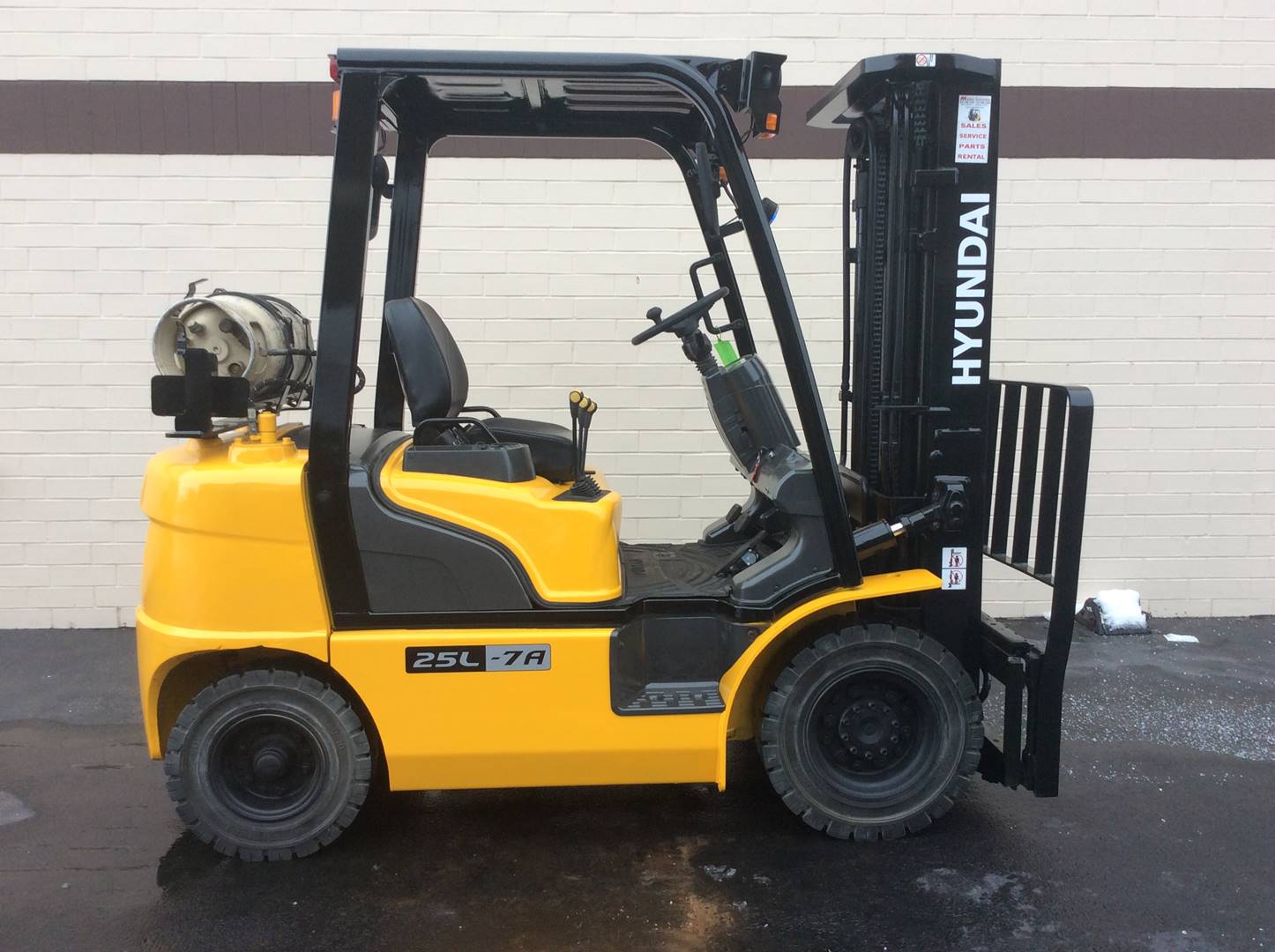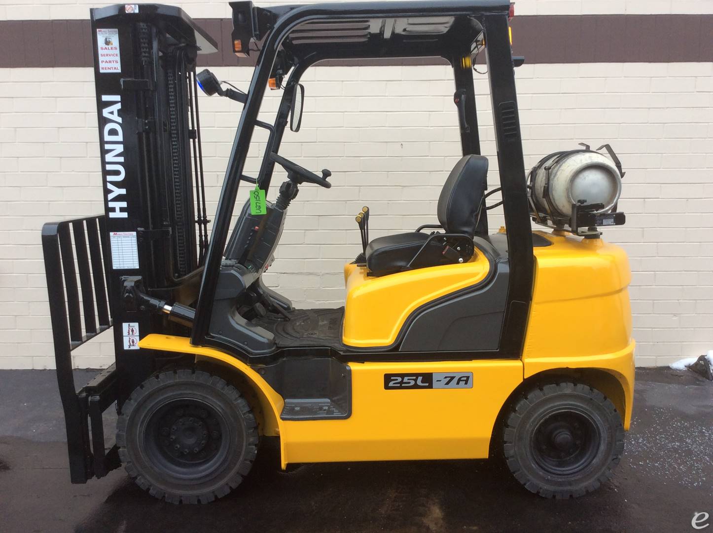 Equipment Description: General Specifications Manufacturer Hyundai Model 25L-7A Type Forklift Engine Engine Type LPG Engine Model Various models depending on configuration Horsepower Approx 60 HP Performance Load Capacity lbs Travel Speed 11 mph unloaded Lift Speed Approx feet per minute unloaded Dimensions Overall Length without forks Approx 8 5 ft Overall Width Approx 4 ft Overall Height collapsed Approx 7 ft Turning Radius Approx 7 5 ft Weight Service Weight Approx lbs Tires Tire Type Pneumatic or solid varies by configuration Front Tires inch Rear Tires inch Steering Braking Steering Hydraulic power steering Service Brake Hydraulic Parking Brake Mechanical hand brake Fuel Capacity Fuel Tank Capacity Approx 17 gallons Others Operator Compartment Ergonomic design with adjustable seat Dashboard LCD digital display for monitoring