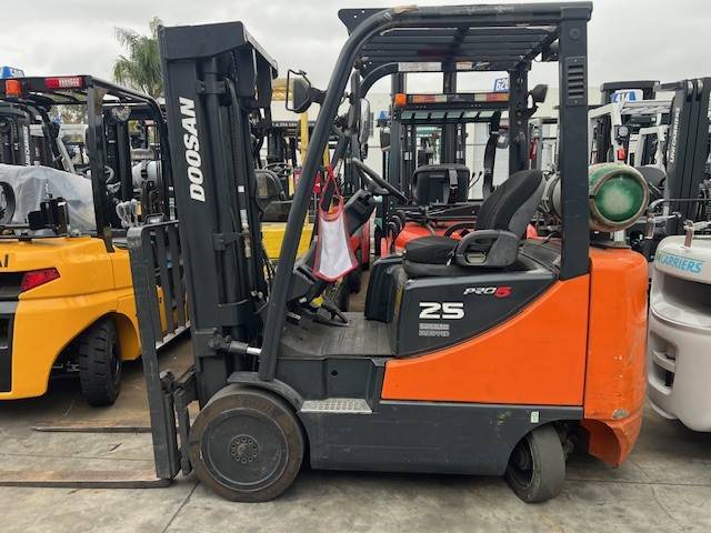 Equipment Description: General Specifications Model Number GC25P-5 Manufacturer Doosan Type Forklift Fuel type LPG Liquid Propane Gas Dimensions Overall Length Approximately 98 inches Overall Width Approximately 45 inches Overall Height Approximately 83 inches Wheelbase Approximately 58 inches Ground Clearance Approximately 4 1 inches Performance Load Capacity lbs Travel Speed Approx mph unloaded Lift Speed Approx ft min unloaded Turning Radius Approximately 87 inches Engine Engine Model G420FE Engine Type LPG Output Power Approximately 60 HP Tires Tire Type Cushion Tire Size Front 21 x 7 x 15 inches Tire Size Rear 16 x 5 xinches Operational Features Hydraulic System Pressure Approximatelypsi Brake Type Hydraulic Additional Features Ergonomically designed operator compartment Adjustable steering column Efficient overhead guard Smooth hydraulic control levers Forks Fork Length Varies