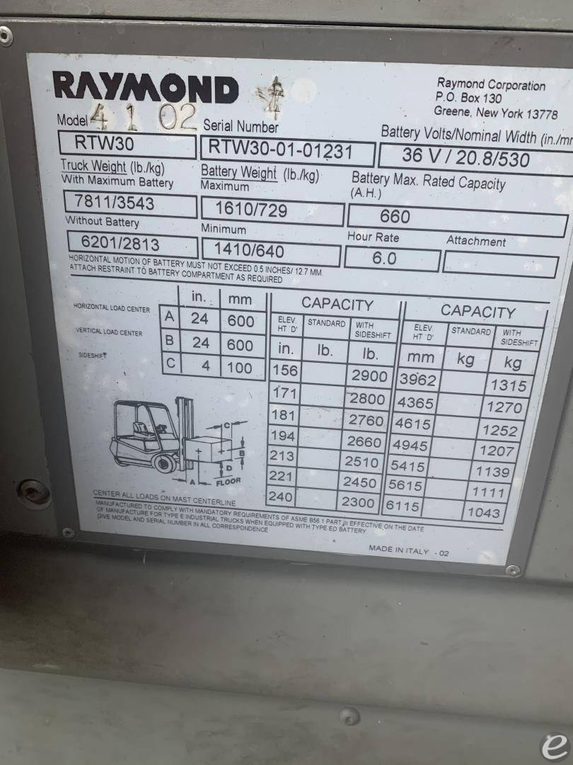 Equipment Description: Model Specifications Model Number RTW30 Manufacturer Raymond Type Forklift Subtype Electric 3 Wheel Sit Down Fuel Type Used Electric Capacity Load Capacity lbs Wheel Count 3 Battery Voltage Varies by configuration Dimensions Overall Length Varies Overall Width Approximately 45 inches Height to Top Overhead Guard Approximately 80 inches Turning Radius Approximately 59 inches Performance Travel Speed Up to 6 5 mph Lifting Speed Varies depending on load Lowering Speed Varies depending on load Gradeability Varies based on weight and incline Operator Environment Steering Power-assisted steering for ease of operation Seat Ergonomic seating with adjustable features Safety Features Automatic Parking Brake Anti-Slip Traction Control Operator Presence Detection System Tires Type Cushion Tires Configuration 3-wheel design for optimal maneuverability