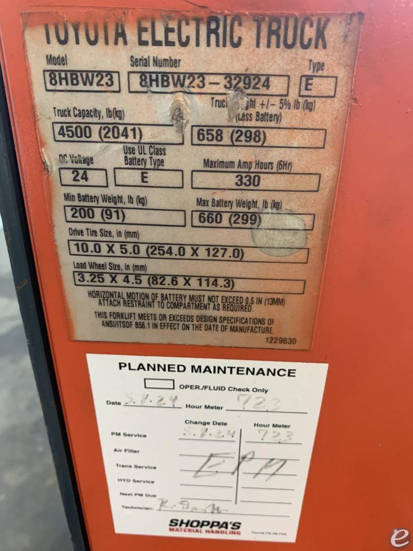 Equipment Description: Manufacturer Toyota Model 8HBW23 General Information Type Walkie Pallet Jack Operator Type Walkie Power Type Electric Dimensions Fork Length Varies Overall Width 24 inches Overall Length 68 inches Height to Top of Handle 48 inches Performance Load Capacity lbs Travel Speed Loaded 3 6 mph Travel Speed Unloaded 3 8 mph Gradeability Loaded 6 Gradeability Unloaded 10 Powertrain Drive Motor AC Voltage 24V Battery Capacity Ah Operational Features Steering Hand-Controlled Brake Electromagnetic Control Handle Ergonomically designed Safety Features Emergency Power Disconnect Anti-Rollback System Horn