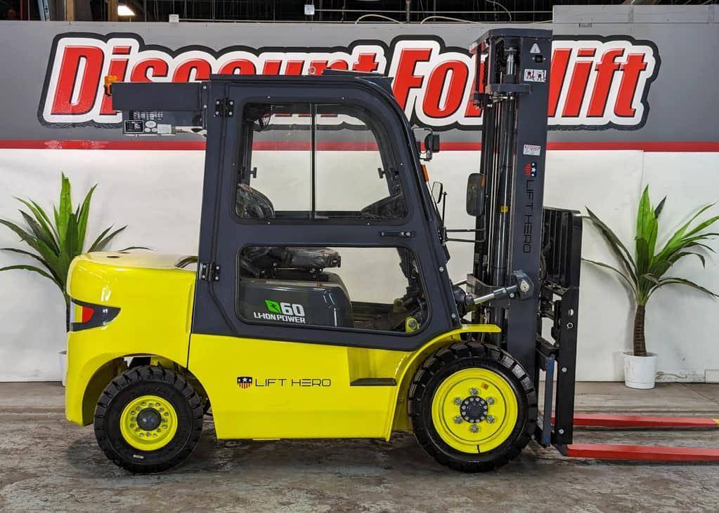 Description: Video https youtu be Fcl34IcdcYc Operators are dubbing LIFT HERO lifts the Tesla of forklifts thanks to our cutting-edge lithium-ion battery technology These batteries require no maintenance and allow for opportunity fast charging ensuring your lift can last an entire shift without interruption With completely sealed electrical components an 18-month or 2 000-hour factory warranty and a robust 5-year or 10 000-hour battery warranty you can count on efficiency and minimal downtime on the job site For added safety our forklifts are painted in bright luminous yellow with red-painted forks to enhance visibility Experience the revolution in material handling with LIFT HERO