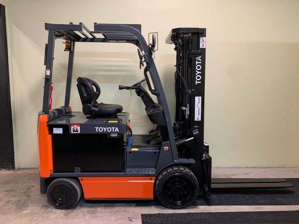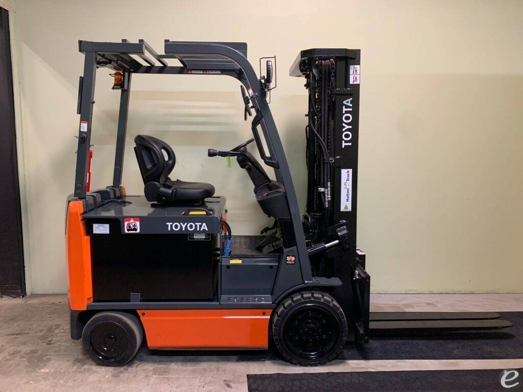Equipment Description: Model Number 8FBCU25 Manufacturer Toyota Type Forklift Power Type Electric Performance Load Capacity lbs Travel Speed Approximatelymph Lift Speed Unloaded Approximatelyfeet per minute Lift Speed Loaded Approximately 86 feet per minute Dimensions Overall Width 42 inches Overall Length Varies with fork length Wheelbase 60 inches Overall Height 89 inches standard Weight Approximate Machine Weight lbs Tires Type Cushion Front Tires 21 x 7 inches Rear Tires 16 x 5 inches Battery Voltage 48V Capacity Ah Additional Features AC Drive Motor Curve Control Regenerative Braking