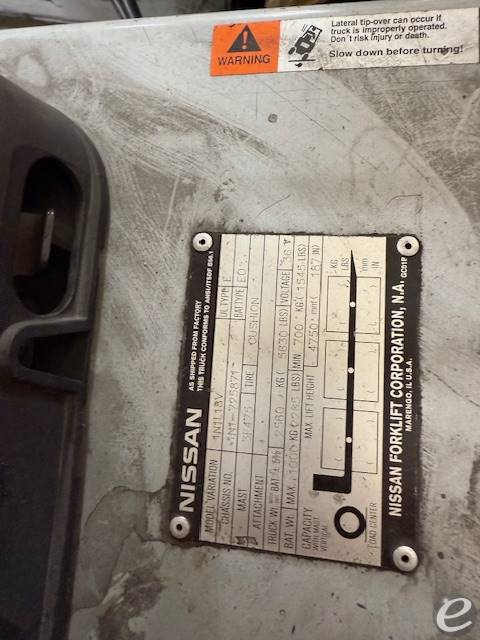 Equipment Description: Model Number 1N1L18V Manufacturer Nissan Type Forklift Subtype Pneumatic Tire 4 Wheel Sit Down Fuel Type Electric Performance Load Capacity lbs Travel Speed Loaded 10 mph Lift Speed Loaded 59 ft min Gradeability Loaded 20 Dimensions Overall Length inches Overall Width 42 inches Overall Height 87 inches Fork Length Varies Wheelbase 59 inches Ground Clearance 4 3 inches Powertrain Engine Type Electric Motor Battery Voltage 48V Chassis Tires Pneumatic Steering Power Steering Operator Environment Seat Type Adjustable Control Joystick or Lever