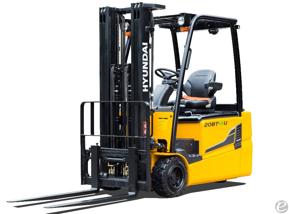 Equipment Description: Overview Model Number 20BT-9U Manufacturer Hyundai Type Forklift Subtype Electric Pneumatic Tire 3 4 Wheel Sit Down Fuel Type Electric Dimensions Length Approximatelyinches includes fork length Width inches Height to Top of Overhead Guard inches Wheelbase inches Ground Clearance Under Mast 4 5 inches Center of Wheelbase 4 3 inches Performance Load Capacity lbs Travel Speed laden unladen 9 3 mph mph Lift Speed laden unladen 76 fpm fpm Gradeability laden unladen 20 25 Tilt Angle forward backward 5 degrees 8 degrees Powertrain Motor AC Electric Motor Battery Voltage 48V Battery Capacity Ah Wheels and Tires Tire Type Pneumatic Front Wheels 18 x 7 - 8 Rear Wheels 15 x 4 - 8 Operator Features Steering Hydrostatic Power Steering Seat Adjustable suspension seat with safety belt Display LED digital display for real-time monitoring Braking System Main Brake Hydraulic with oil-immersed brake system Parking Brake Mechanical lever type