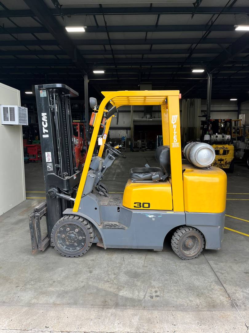 Equipment Description: General Information Manufacturer TCM Model Number FCG30-3HL Type Forklift Subtype Cushion Tire 4 Wheel Sit Down Fuel Type LP Gas Dimensions Overall Length inches Overall Width 45 inches Overall Height Cab 84 inches Wheelbase 65 inches Ground Clearance 3 5 inches Performance Load Capacity lbs Travel Speed 11 mph Turning Radius 82 inches Engine Specifications Engine Type Internal Combustion Engine Make Nissan Model K21 Horsepower Around 60 HP Cylinder 4 Tire Specifications Tire Type Cushion Front Tire Size 21x7x15 Rear Tire Size 16x5x10 5 Operational Details Operator Position Sit Down Steering Power Steering Fork Length Varies
