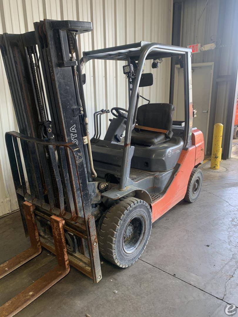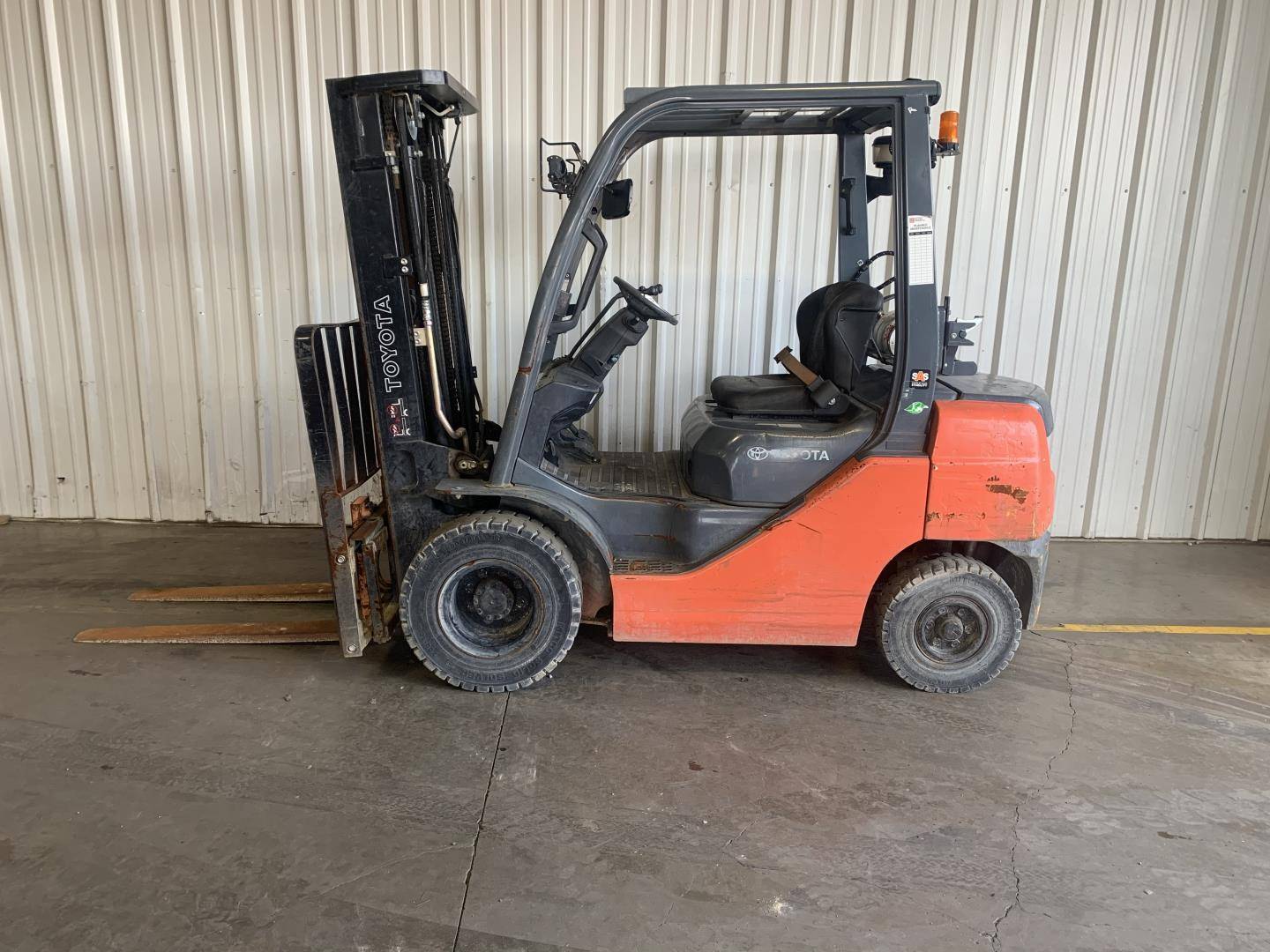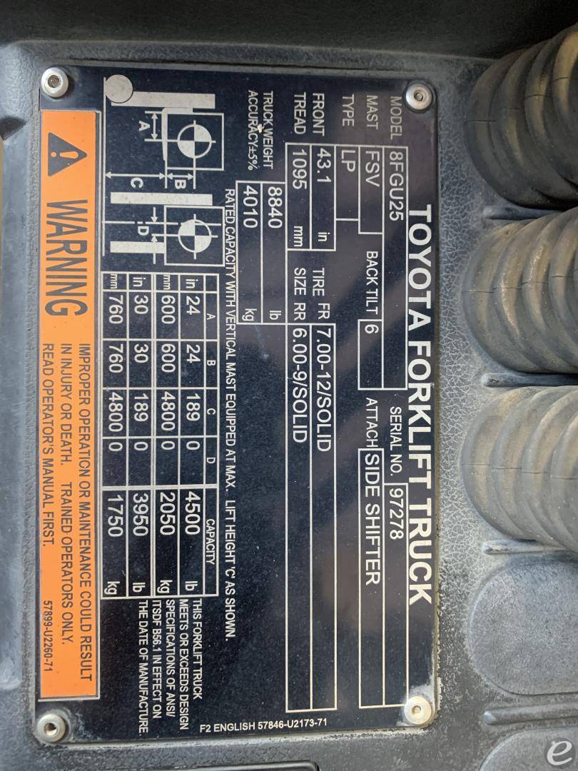 Equipment Description: General Information Model 8FGU25 Manufacturer Toyota Type Forklift Engine Engine Type Internal Combustion Fuel Type LPG Gasoline Engine Model Toyota 4Y Dimensions Overall Length approximatelyinches Overall Width approximately 45 inches Overall Height to top of overhead guard approximately 83 inches Wheelbase around 59 inches Weights Weight approximatelylbs Performance Load Capacity lbs Travel Speed unloaded approximately 11 mph Turning Radius approximately 87 inches Tires Tire Type Pneumatic Front Tires 7 00-12-12PR Rear Tires 6 00-9-10PR Brakes Service Brake Hydraulic Parking Brake Mechanical Lever Hydraulic System Auxiliary Hydraulic Flow varies Attachments Fork Length varies