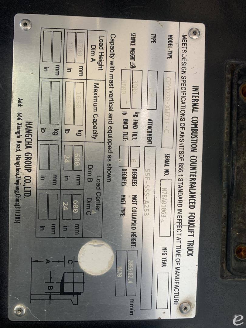 Equipment Description: Model Number FP20C Manufacturer Hangcha Type Forklift Subtype Cushion Tire 4 Wheel Sit Down Indoor Warehouse Fuel Type LP Gas Powertrain Engine Internal combustion Fuel System LPG Transmission Powershift Dimensions Overall Length inches Overall Width 43 inches Overall Height to top of overhead guard 83 inches Capacity Load Capacity lbs Performance Top Speed 11 mph Gradeability 18 loaded Tires Type Cushion Number of Wheels 4 Operator Requirements Seat Standard sit-down with adjustable features Steering Power steering Hydraulics Hydraulic Controls Fingertip controls Additional Features Safety Features Operator presence sensing system seatbelt Attachments Forks length varies
