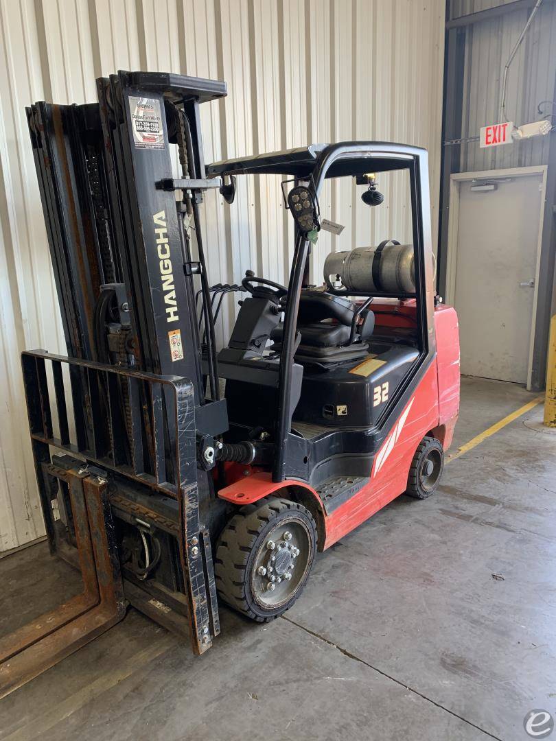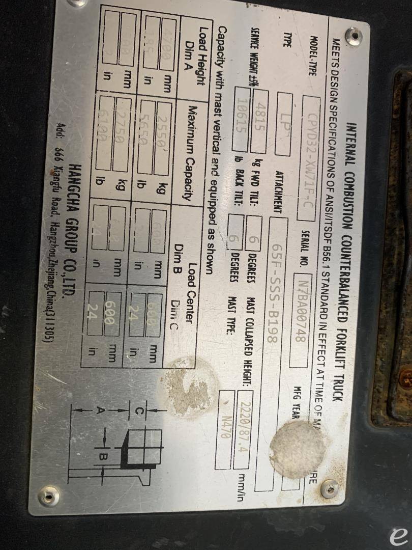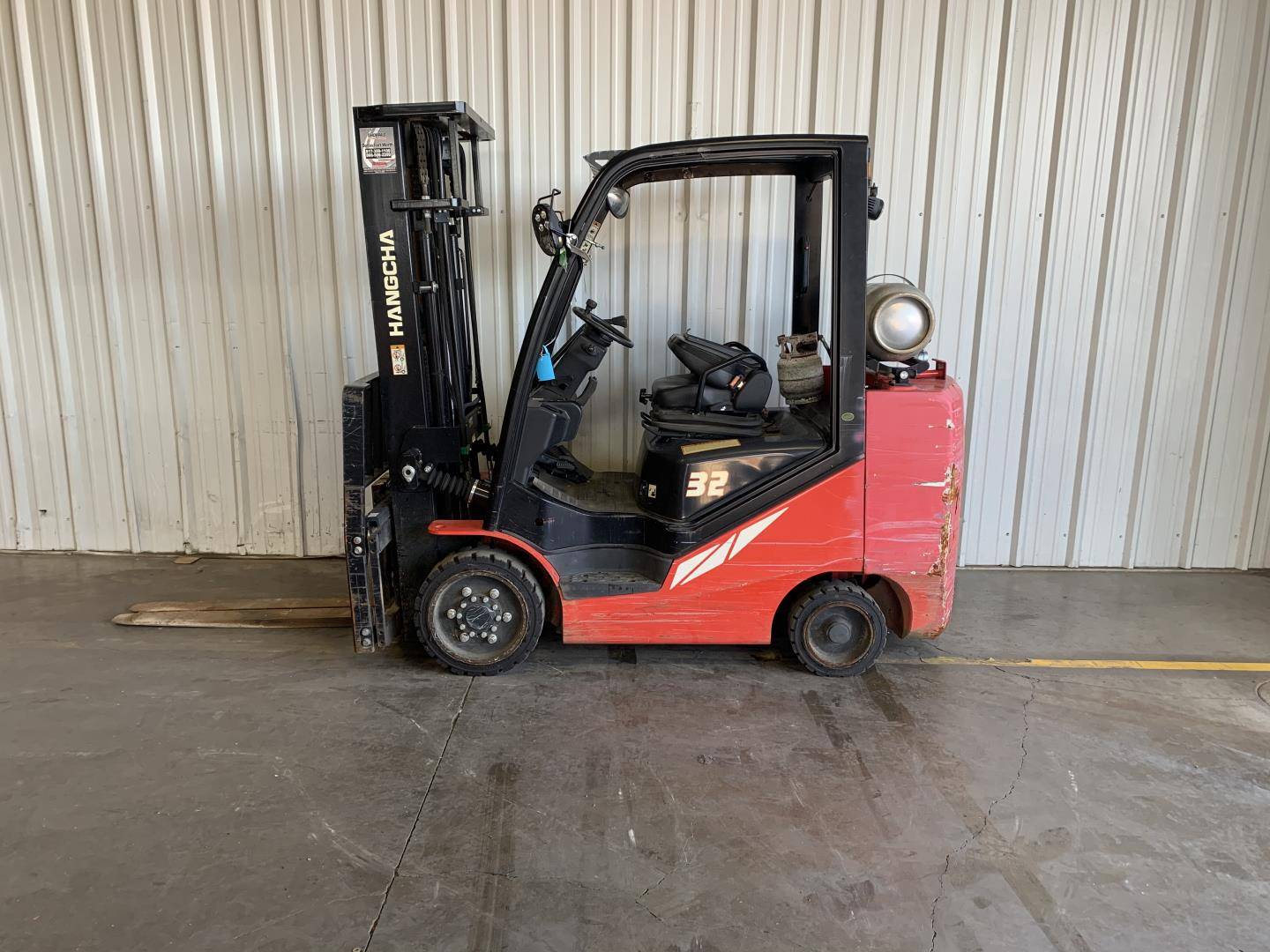 Equipment Description: General Specifications Model Number FP32C Manufacturer Hangcha Type Forklift Subtype Cushion Tire 4 Wheel Sit Down Indoor Warehouse Fuel Type LP Gas Dimensions Overall Width Approximately 42 inches Overall Length without forks Approximately 92 inches Overall Height overhead guard Approximately 85 inches Wheelbase Approximately 57 inches Performance Load Capacity pounds Travel Speed Approximately 10 mph Turning Radius Approximately 82 inches Powertrain Engine Type Fuel-start LP Gas Cylinders 4 Wheels and Tires Tire Type Cushion Front Tire Size Approximately 21 inches Rear Tire Size Approximately 16 inches Operational Steering Type Power Steering Brakes Hydraulic Fork Length Varies