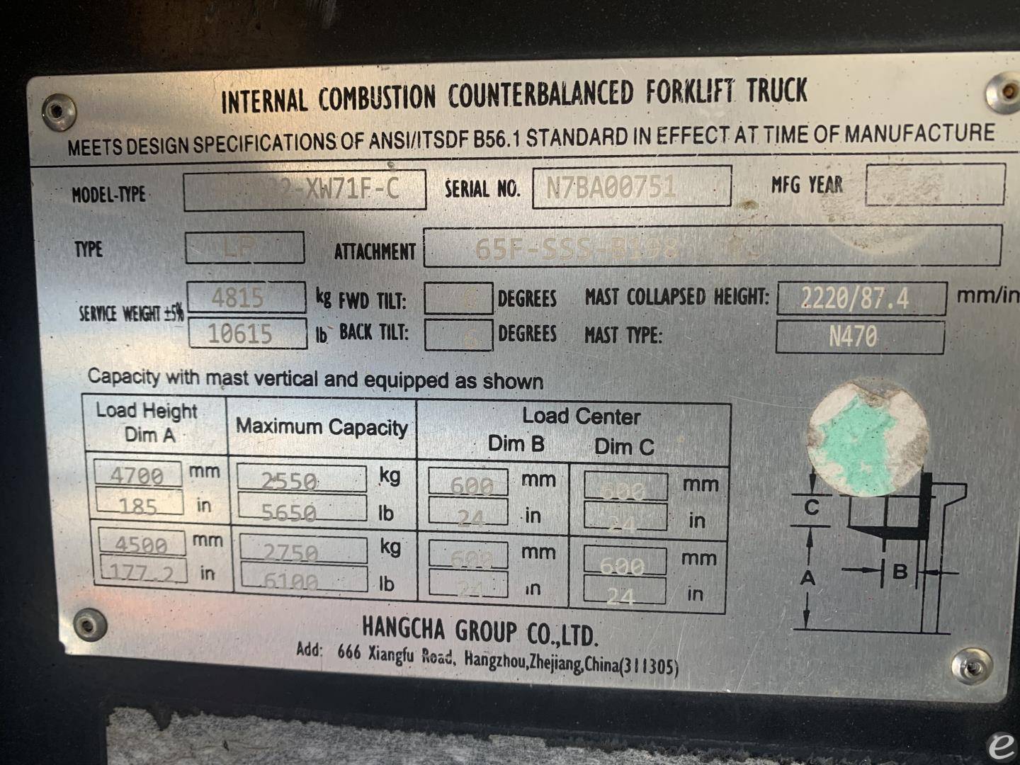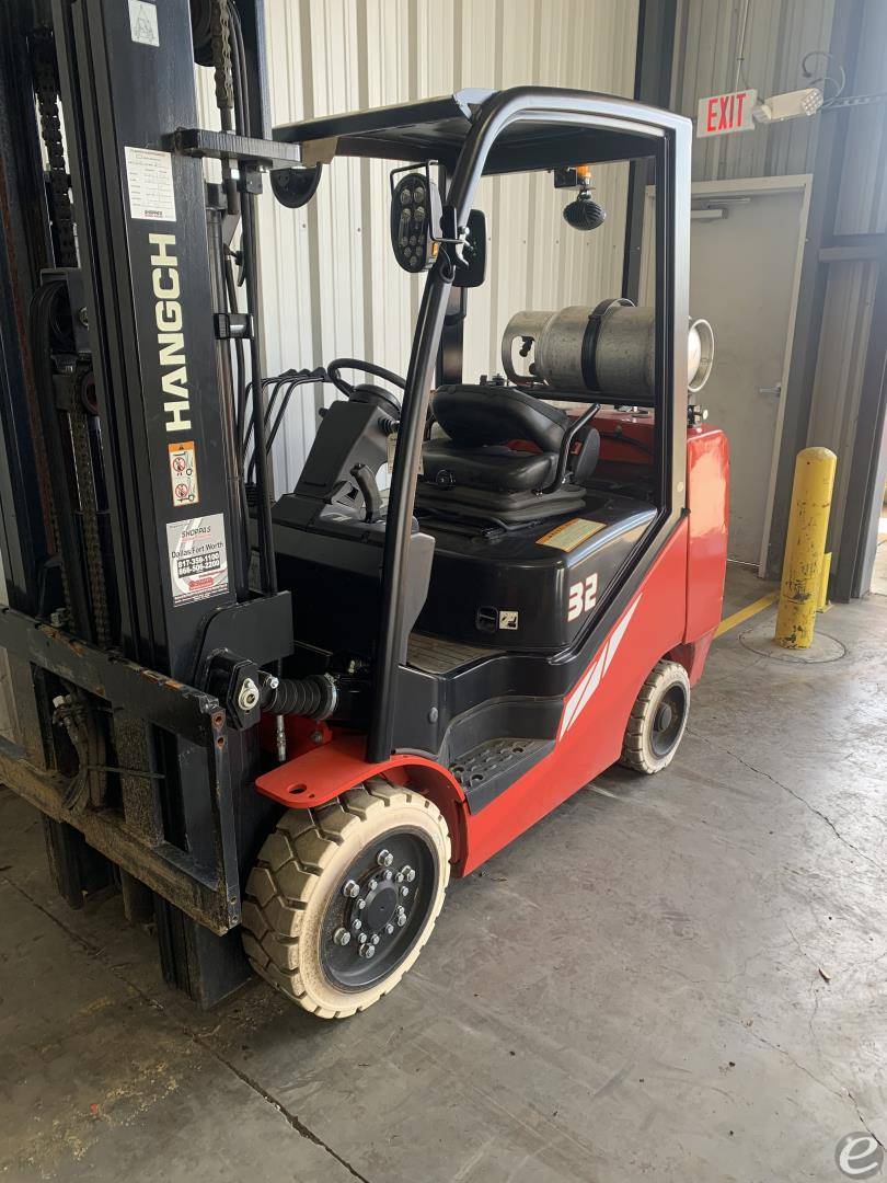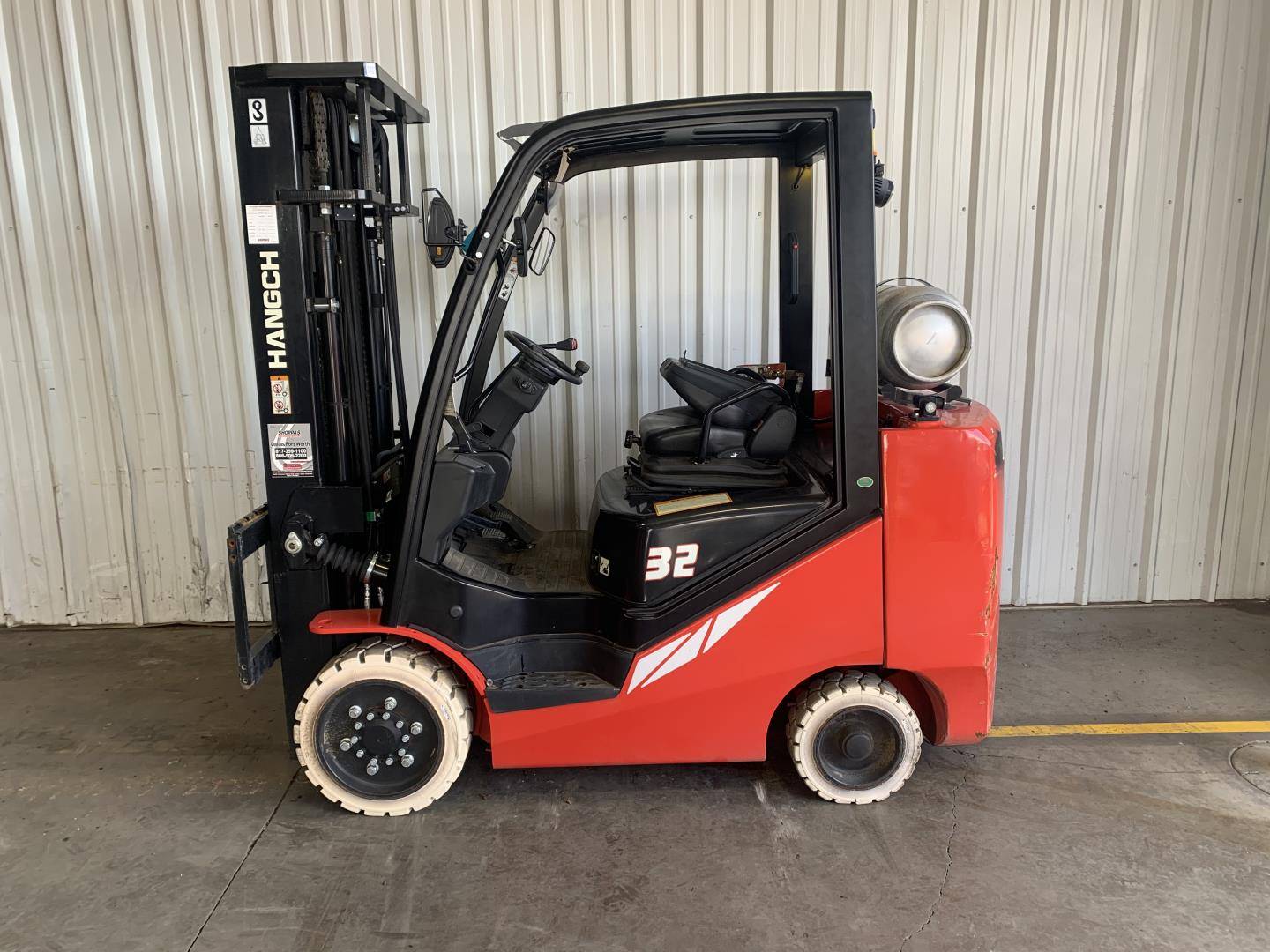 Equipment Description: General Specifications Model Number FP32C Manufacturer Hangcha Type Forklift Subtype Cushion Tire 4 Wheel Sit Down Indoor Warehouse Fuel Type LP Gas Dimensions Overall Width Approximately 42 inches Overall Length without forks Approximately 92 inches Overall Height overhead guard Approximately 85 inches Wheelbase Approximately 57 inches Performance Load Capacity pounds Travel Speed Approximately 10 mph Turning Radius Approximately 82 inches Powertrain Engine Type Fuel-start LP Gas Cylinders 4 Wheels and Tires Tire Type Cushion Front Tire Size Approximately 21 inches Rear Tire Size Approximately 16 inches Operational Steering Type Power Steering Brakes Hydraulic Fork Length Varies