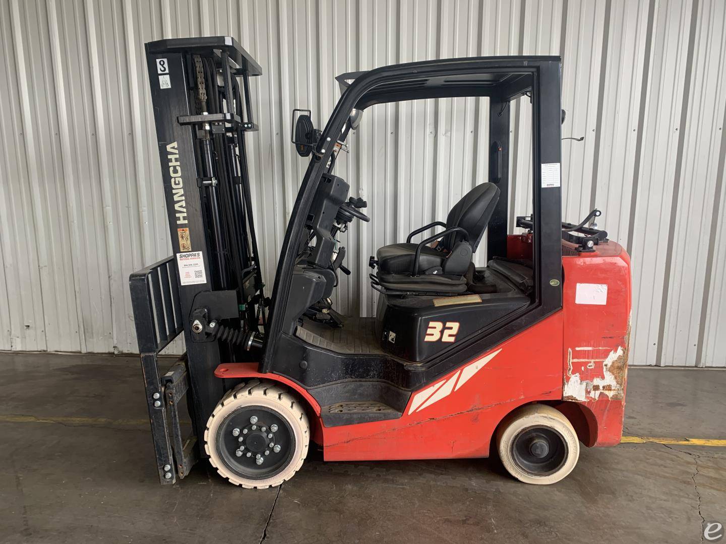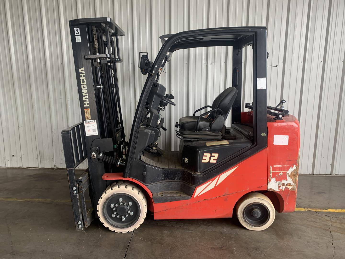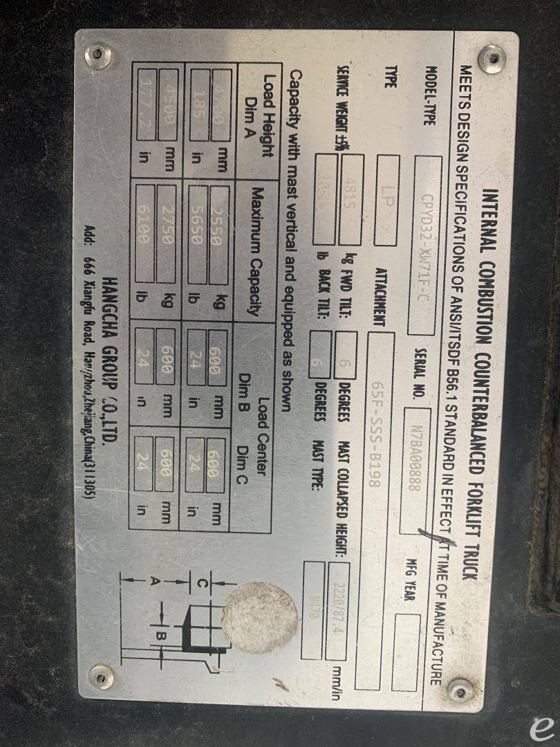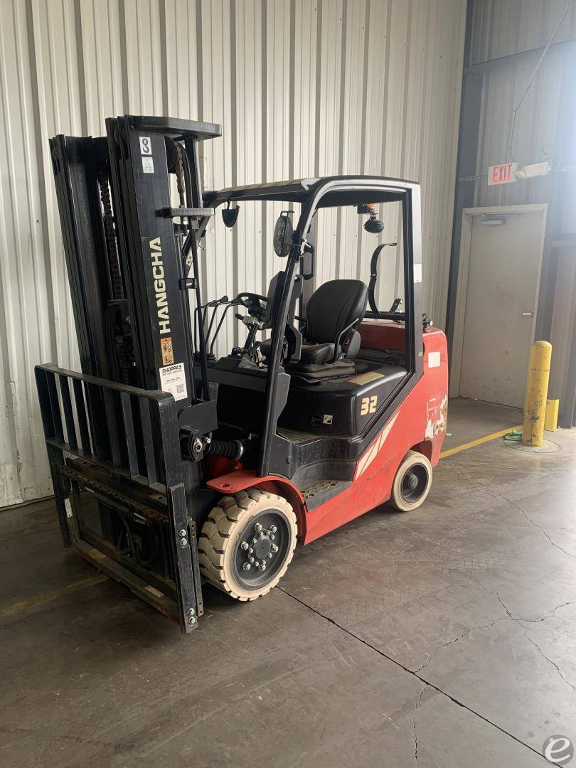 Equipment Description: General Specifications Model Number FP32C Manufacturer Hangcha Type Forklift Subtype Cushion Tire 4 Wheel Sit Down Indoor Warehouse Fuel Type LP Gas Dimensions Overall Width Approximately 42 inches Overall Length without forks Approximately 92 inches Overall Height overhead guard Approximately 85 inches Wheelbase Approximately 57 inches Performance Load Capacity pounds Travel Speed Approximately 10 mph Turning Radius Approximately 82 inches Powertrain Engine Type Fuel-start LP Gas Cylinders 4 Wheels and Tires Tire Type Cushion Front Tire Size Approximately 21 inches Rear Tire Size Approximately 16 inches Operational Steering Type Power Steering Brakes Hydraulic Fork Length Varies