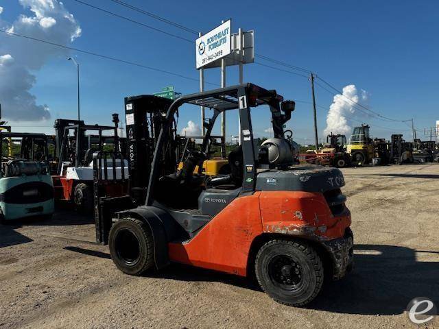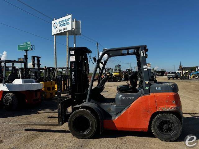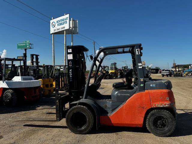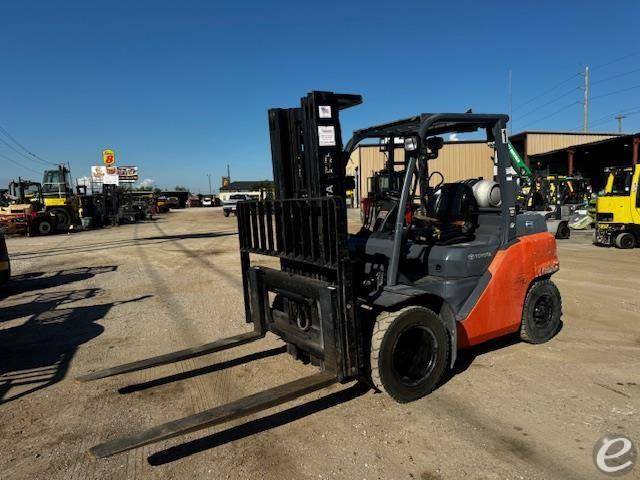 Description: Toyota 8FG35U 8 000 Capacity 3-Stage Mast Side-Shift Solid Tires Dual Drive Tires LPG EngineHours