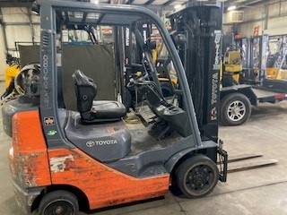 Equipment Description: Manufacturer Toyota Model Number 8FGCU25 General Specifications Power Type LPG Liquid Petroleum Gas Operator Position Sit-down Tire Type Cushion Number of Wheels 4 Dimensions Length to Face of Forks ft Overall Width Without Load 3 5 ft Height to Top of Overhead Guard 7 ft Turning Radius in Minimum Outside Turning Radius 5 5 ft Wheelbase ft Performance Rated Load Capacity lbs Load Center 24 in Travel Speed Loaded mph Travel Speed Unloaded mph Lifting Speed Loaded ft min Lifting Speed Unloaded ft min Lowering Speed Loaded 98 ft min Lowering Speed Unloaded 98 ft min Engine Specifications Engine Model Toyota 4Y Engine Type 4-cylinder water-cooled Displacement in Rated Power 51 hp RPM Torque 6 lbf ft RPM Weights Service Weight lbs Axle Loading Front lbs With Load Axle Loading Rear lbs With Load Wheel Specifications Front Tires 21x7x15 Rear Tires 16x5x10 Tread Front Rear 36 36 in Transmission Transmission Type Powershift Number of Speeds Forward Reverse 1 1 Brakes Service Brake Hydraulic Parking Brake Mechanical hand operated