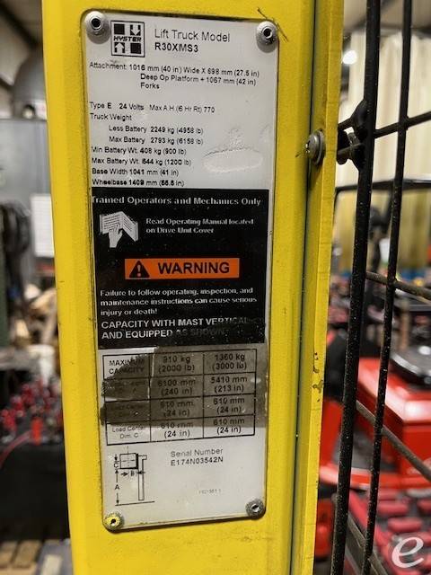 Equipment Description: Model Number R30XMS3 Manufacturer Hyster Type Forklift Subtype Electric Order Picker Fuel Type Used Electric Capacity Load Capacity lbs Dimensions Overall Length in Overall Width 39 in Chassis Wheelbase 59 in Ground Clearance 3 in Performance Travel Speed 6 mph Gradeability 10 Turning Radius 70 in Electrical System Battery Voltage 24 V Tires Drive Tires Polyurethane Load Wheels Polyurethane