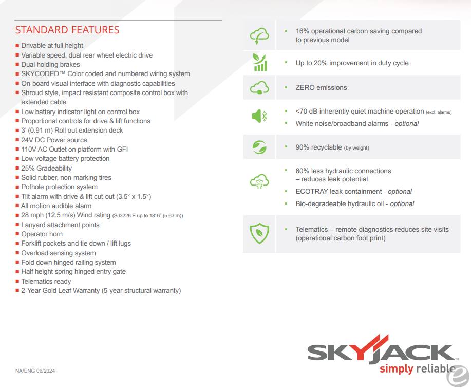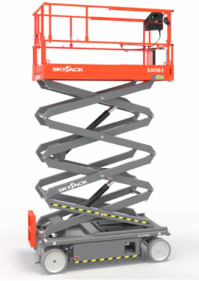 Equipment Description: New SkyJack SJ4726E Scissor Lift with 31 7 of work height 47 overall width 91 6 overall length foldable railing 75 90 stowed height rails either down up 4 roll out extension deck 25 gradeability 60 second lift speed lb Overall capacity operable at full height solid non-marking tires 24volt deep cycle battery system with charger included plus a beautiful finish STOCK PHOTOS OTHER SIZE OPTIONS AVAILABLE