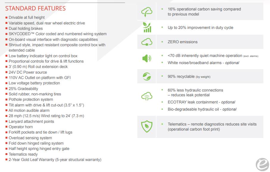 Equipment Description: New SkyJack SJ4740E Scissor Lift with 45 of work height 47 overall width 95 2 overall length foldable railing 79 99 stowed height rails either down up 3 roll out extension deck 25 gradeability 88 second lift speed lb Overall capacity operable at full height solid non-marking tires 24volt deep cycle battery system with charger included plus a beautiful finish STOCK PHOTOS