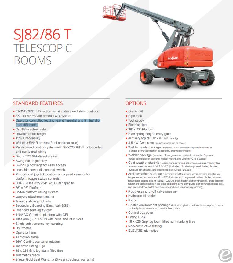 Equipment Description: New SkyJack SJ86 T Boom Lift with Telescopic Mast with 92 of working height 76 10 horizontal reach 36 x96 platform size 8 2 stowed width 4 8 tail swing 9 10 of stowed height 10 3 transportation height 42 6 stowed length 34 9 transportation length 5 6 jib length 45 gradeability 500 750 lb Capacity grip lug foam filled tires Deutz TD2 9L4 diesel engine wet disc brake system operator controlled locking rear differential and limited slip front differential operable at full height plus a beautiful finish STOCK PHOTOS OTHER SIZE OPTIONS AVAILABLE