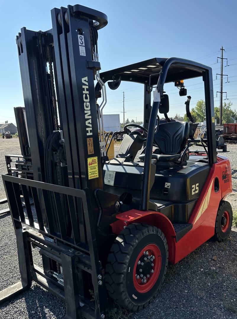 Equipment Description: W2333R Nearly New Hangcha 5K Pneumatic forklift with Nissan K25 engine LP fuel power steering tilt wheel back up alarm strobe light LED combination lights rear view mirror Blue rear light head lights 40 9 side-shift carriage w LBR panoramic mirror 48 standard forks tilt cylinder boots rear horn handle full suspension seat and roof cap Rental with underhours