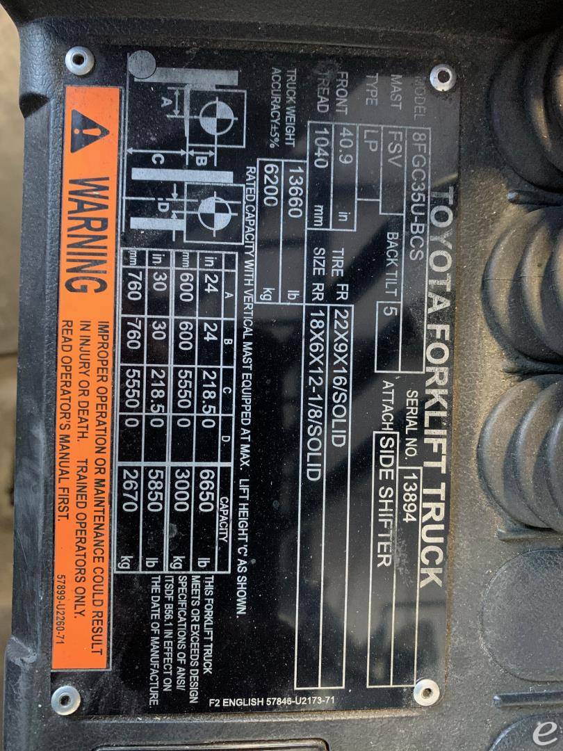 Equipment Description: Model Manufacturer Model Number 8FGC35U-BCS Manufacturer Toyota Type Forklift Subtype Electric Stand Up End Control Docker General Specifications Power Source Electric Operator Position Stand-Up Control Type End Control Dimensions Overall Length Varies based on fork length Overall Height Not specified mast excluded Width Approximately 42 inches Wheelbase Approximately 71 inches Weight Approximatelylbs Performance Load Capacity lbs Travel Speed Full Load Approximately 8 mph Travel Speed No Load Approximately 9 mph Chassis Tire Type Cushion Suspension Rigid Battery Battery Type Industrial Voltage 36V Battery Capacity Varies based on configuration Additional Features Steering Electric Power Steering Braking Electronic Operator s Compartment Ergonomic design