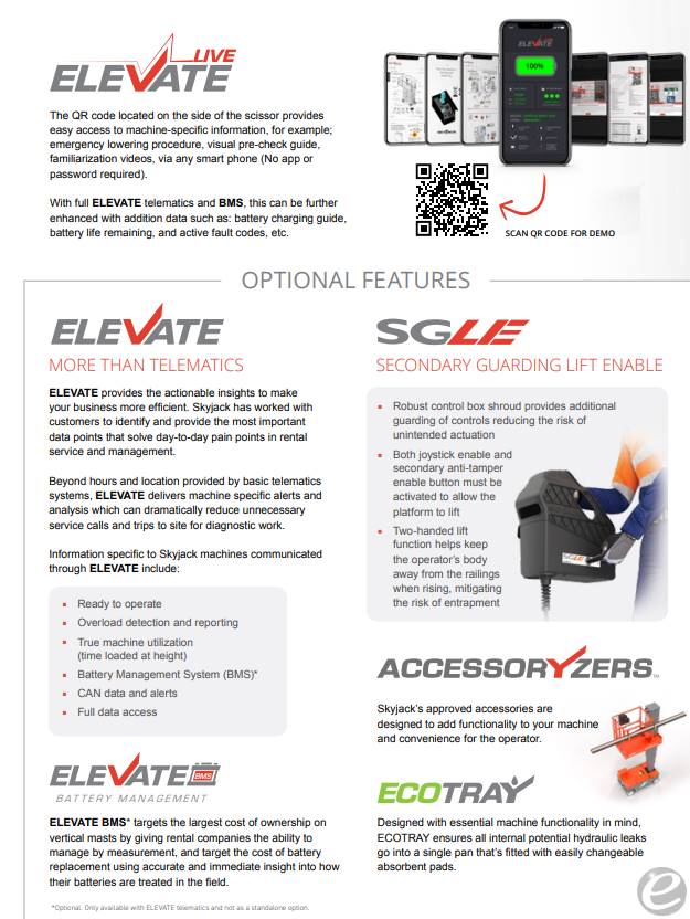 Equipment Description: New SkyJack SJ20E Personnel lift with vertical mast 25 6 of work height 31 5 overall width 54 overall length 79 5 stowed height 16 roll out extension deck 25 gradeability 26 second lift speed lb Capacity operable at full height solid non-marking tires 24volt deep cycle battery system with universal smart 110volt charger with extract charging data via Bluetooth plus a beautiful finish STOCK PHOTOS OTHER SIZE OPTIONS AVAILABLE