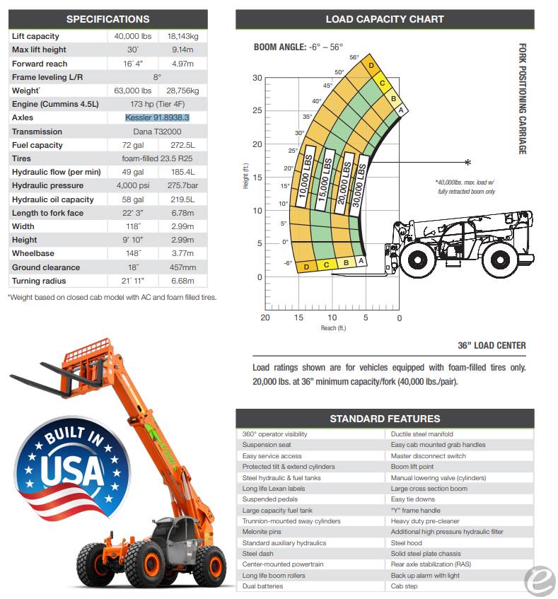 Equipment Description: New Xtreme XR4030-E Telehandler withlb Capacity Less de-rate 30 of max lift height 16 4 of max forward reach Cummins 4 5L Diesel engine -hp T4f Kessleraxles Dana T32000 transmission 72gal Fuel tank foam filled tires suspension seat plus a beautiful finish STOCK PHOTOS OTHER OPTIONS AVAILABLE