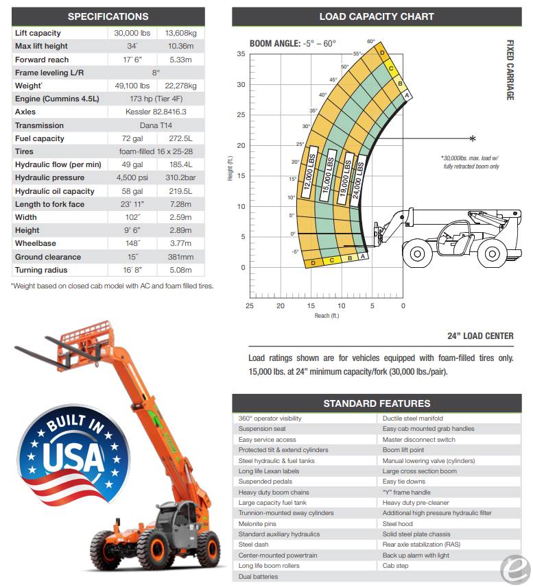Equipment Description: New Xtreme XR3034-D Telehandler withlb Capacity Less de-rate 34 of max lift height 17 6 of max forward reach Cummins 4 5L Diesel engine -hp T4f Kessleraxles Dana T14 transmission 58gal Fuel tank foam filled tires suspension seat plus a beautiful finish STOCK PHOTOS OTHER OPTIONS AVAILABLE