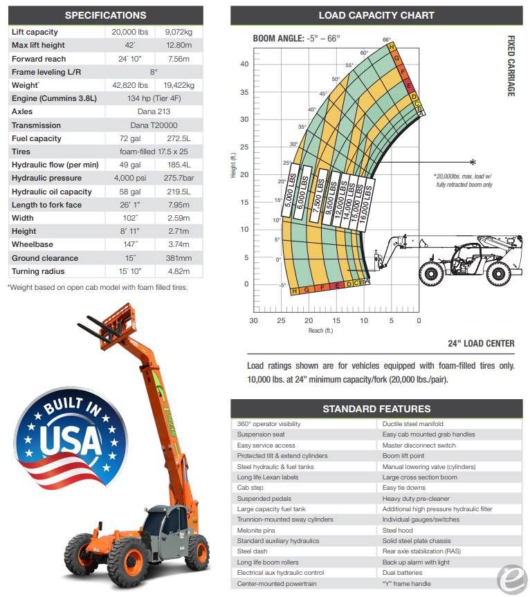 Equipment Description: New Xtreme XR2042-C Telehandler withlb Capacity Less de-rate 42 of max lift height 24 10 of max forward reach Cummins 3 8L Diesel engine -hp T4f Danaaxles Dana T20000 transmission 72gal Fuel tank foam filled tires suspension seat plus a beautiful finish STOCK PHOTOS OTHER OPTIONS AVAILABLE