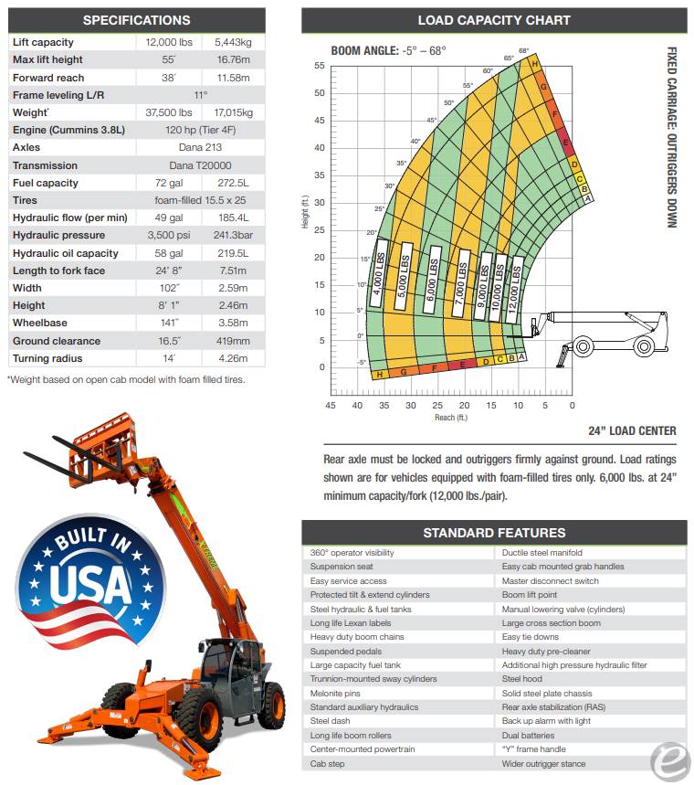 Equipment Description: New Xtreme XR1255-B Telehandler withlb Capacity Less de-rate 55 of max lift height 38 of max forward reach Cummins 3 8L Diesel engine -hp T4f Danaaxles Dana T20000 transmission 72gal Fuel tank foam filled tires suspension seat plus a beautiful finish STOCK PHOTOS OTHER OPTIONS AVAILABLE