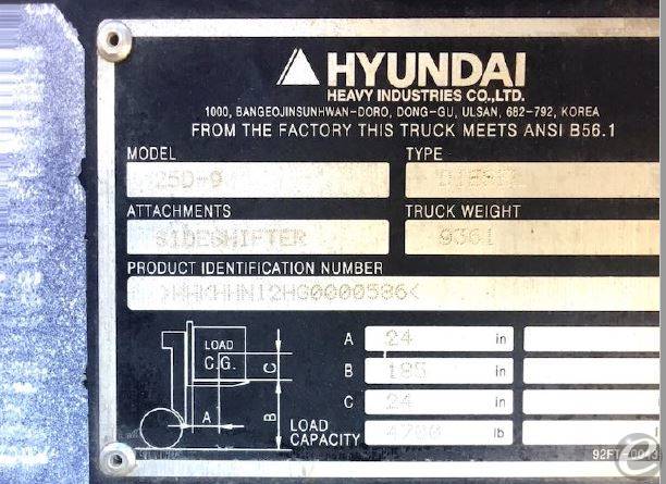2016 Diesel Hyundai 25D-9 Pneumatic Tire 4 Wheel Sit Down