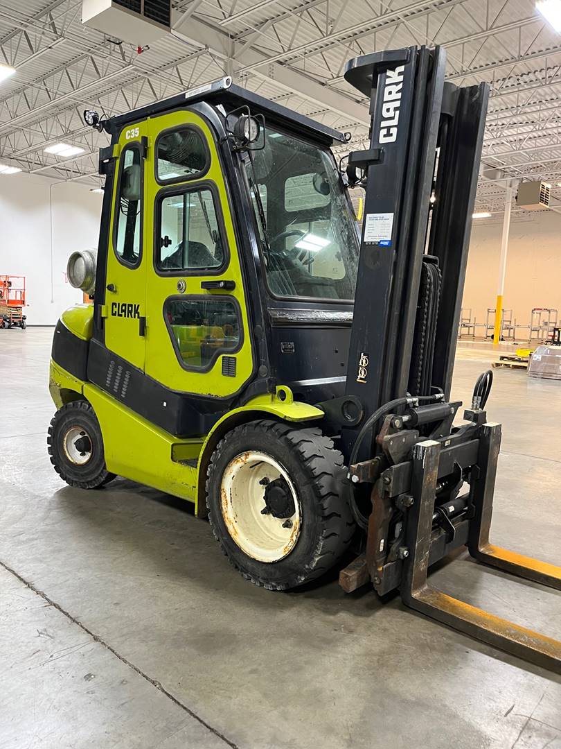 Equipment Description: 2013 Clark C35 with Cab 3 Stage Mast 87 182 4 Way Hydraulics Sideshifting Fork Positioner Solid Pneumatic Tires 48 Forks