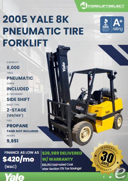 Description: YEAR 2005 MANUFACTURER Yale MODEL GLP080LJ CAPACITY 8000 FUEL LP Gas SUBCATEGORY Pneumatic Tire 4 Wheel Sit Down MAST TYPE Two Stage MAST SPEC 109 169 SERIAL E813V03423C SIDE SHIFTER Yes CONDITION Used HOUR METER 9983 LOCATION Arizona 85120 Description