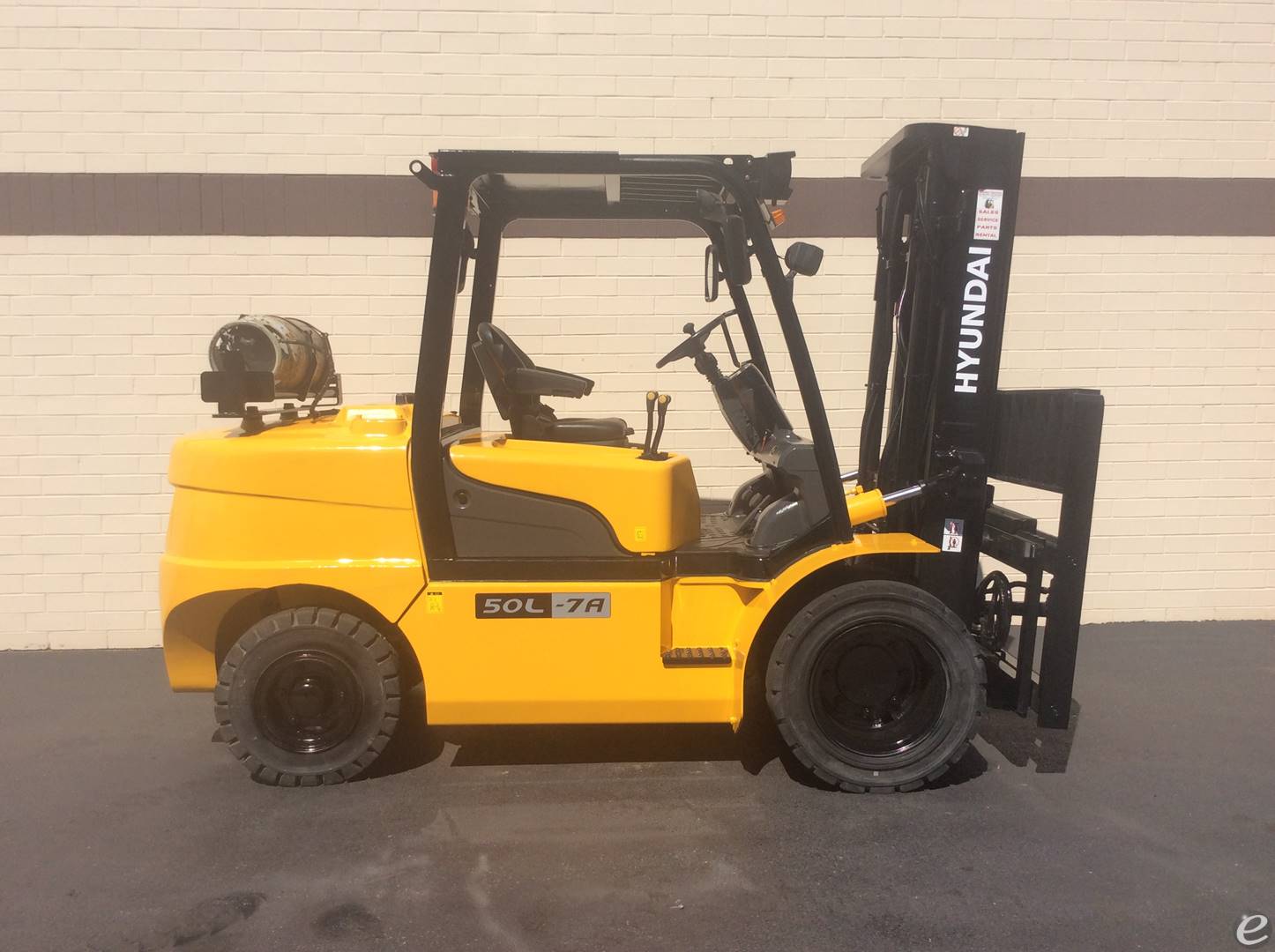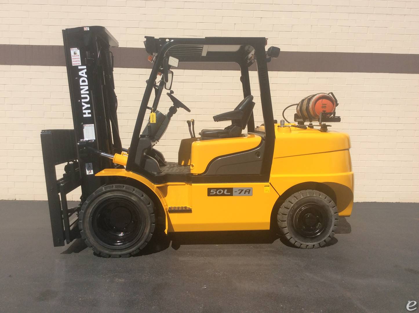Equipment Description: General Information Model Number 50L-7A Manufacturer Hyundai Type Forklift Subtype Pneumatic Tire 4 Wheel Sit Down Engine Engine Manufacturer Hyundai Engine Type Diesel Rated Output Approximately 74 HP Displacement Around 4 4 liters Dimensions Overall Length inches or varies excluding forks Overall Width 55 inches Overall Height to Top of Overhead Guard 87 inches Wheelbase 86 inches Performance Load Capacity lbs Travel Speed Unloaded Up tomph Lifting Speed Unloaded Approximatelyfeet min Gradeability Loaded 23 Weights Service Weight lbs Tires Type Pneumatic Number of Wheels 4 Hydraulics Hydraulic System Pressure Approximatelypsi