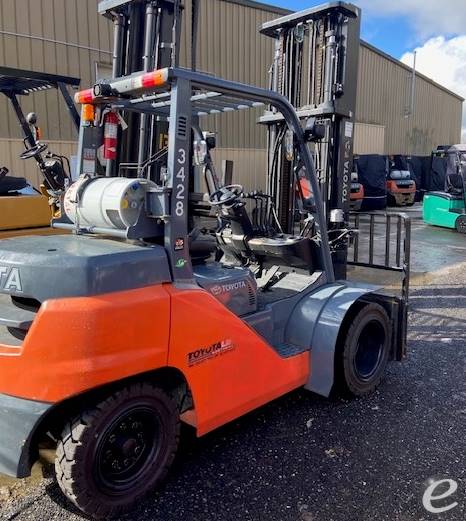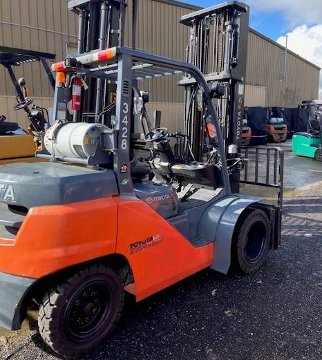 Equipment Description: General Information Manufacturer Toyota Model Number 8FG35U Type Forklift Subtype Pneumatic Tire 4 Wheel Sit Down Engine Engine Type Internal Combustion Fuel Type Gasoline Engine Horsepower Approximately 60 HP Dimensions Overall Length Approximatelyinches without forks Overall Width Approximately 47 inches Overall Height to Overhead Guard Approximately 85 inches Wheelbase Approximately 69 inches Ground Clearance Approximately 5 inches Capacity Load Capacity lbs Load Center 24 inches Tires Tire Type Pneumatic Tires Number of Wheels 4 Performance Travel Speed unloaded Approximately 12 miles per hour Lifting Speed loaded Approximately 95 feet per minute Lowering Speed loaded Approximatelyfeet per minute Brakes Service Brake Hydraulic Parking Brake Mechanical Lever Hydraulics Hydraulic System Pressure Approximatelypsi Operator Compartment Steering Fully hydrostatic power steering Seat Adjustable with Operator Presence Sensing System