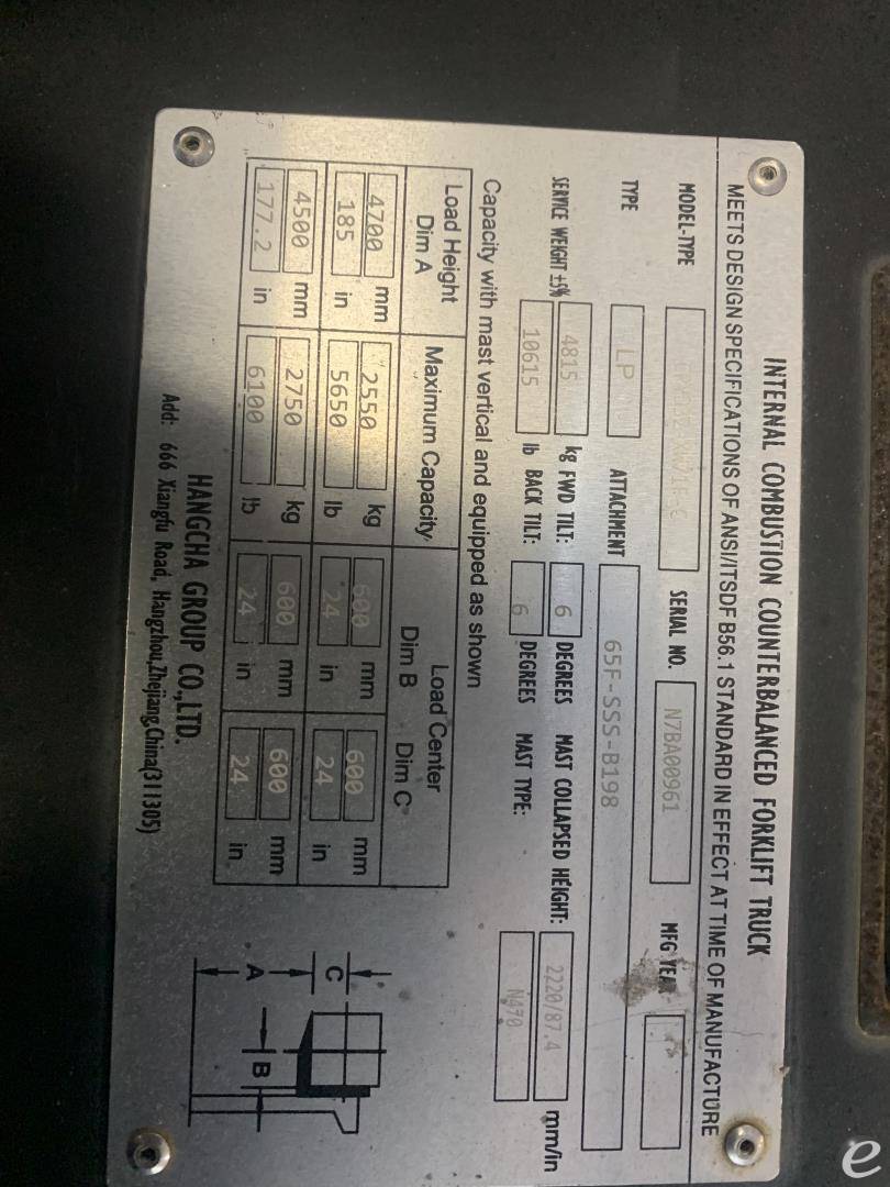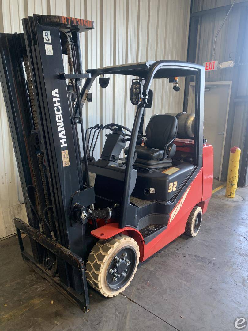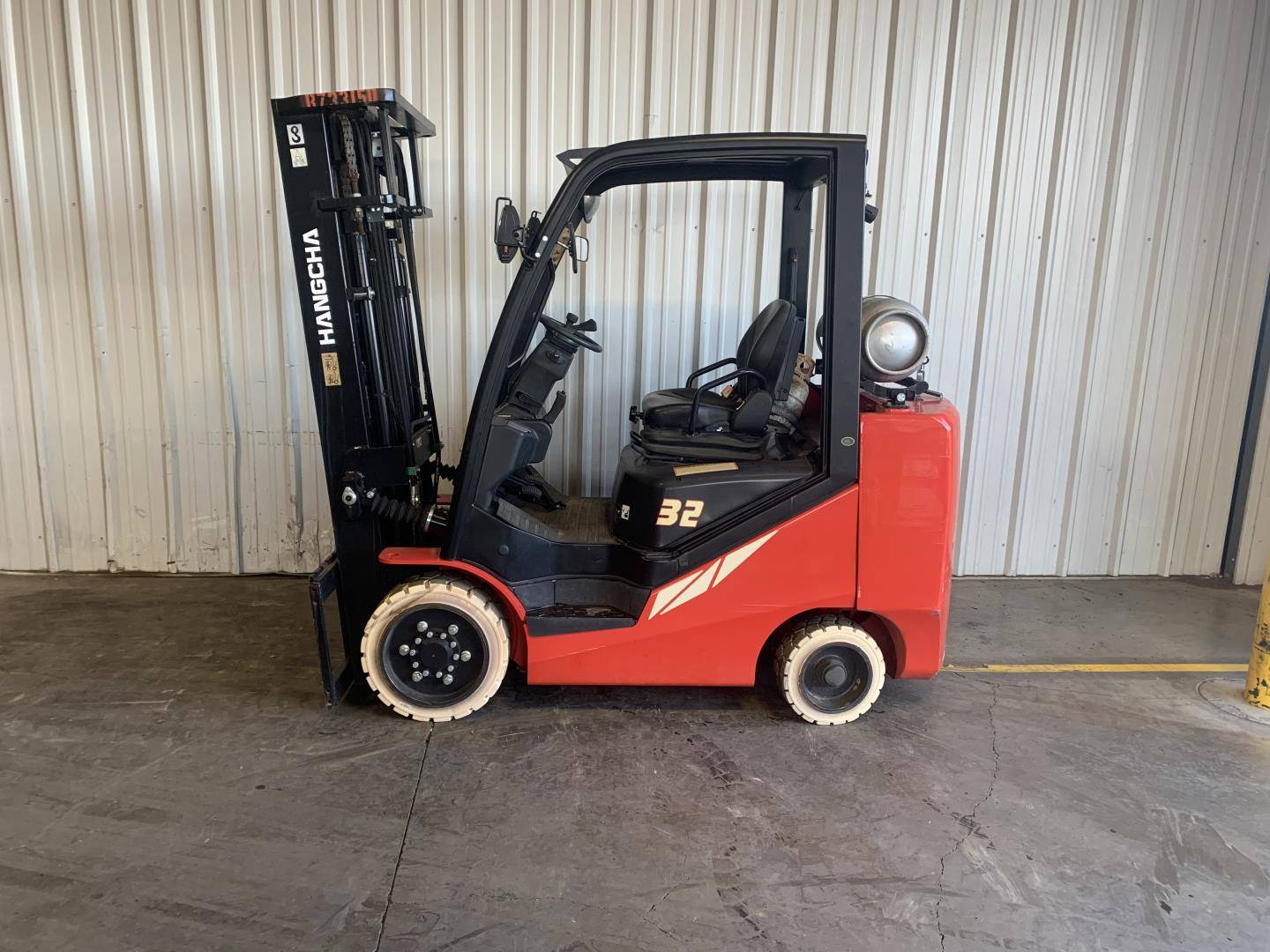 Equipment Description: General Specifications Model Number FP32C Manufacturer Hangcha Type Forklift Subtype Cushion Tire 4 Wheel Sit Down Indoor Warehouse Fuel Type LP Gas Dimensions Overall Width Approximately 42 inches Overall Length without forks Approximately 92 inches Overall Height overhead guard Approximately 85 inches Wheelbase Approximately 57 inches Performance Load Capacity pounds Travel Speed Approximately 10 mph Turning Radius Approximately 82 inches Powertrain Engine Type Fuel-start LP Gas Cylinders 4 Wheels and Tires Tire Type Cushion Front Tire Size Approximately 21 inches Rear Tire Size Approximately 16 inches Operational Steering Type Power Steering Brakes Hydraulic Fork Length Varies