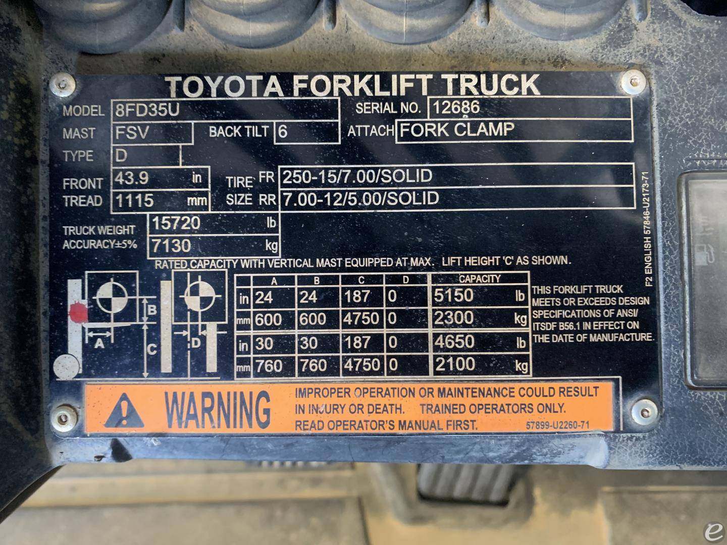 Equipment Description: Model 8FD35U Manufacturer Toyota Type Forklift Subtype Pneumatic Tire 4 Wheel Sit Down General Specifications Power Source Diesel Operator Position Sit Down Tires Pneumatic Dimensions Overall Length inches Overall Width 55 inches Overall Height to top of overhead guard 88 inches Wheelbase 74 inches Ground Clearance 9 inches Performance Load Capacity lbs Travel Speed with load 11 mph Lifting Speed with load 99 feet min Gradeability with load 22 Engine Type 4 Cylinder Diesel Engine Model Toyota 1KD Engine Power 66 HP Displacement cubic inches Hydraulic System Pump Output gallons min System Pressure psi Other Features Steering Hydraulic Power Steering Brake Type Wet Disc Brakes Transmission Powershift Number of Speeds 1 Forward 1 Reverse Forks Fork Length Varies