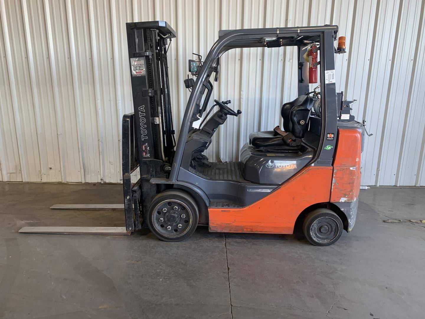 Equipment Description: Manufacturer Toyota Model Number 8FGCU25 General Specifications Power Type LPG Liquid Petroleum Gas Operator Position Sit-down Tire Type Cushion Number of Wheels 4 Dimensions Length to Face of Forks ft Overall Width Without Load 3 5 ft Height to Top of Overhead Guard 7 ft Turning Radius in Minimum Outside Turning Radius 5 5 ft Wheelbase ft Performance Rated Load Capacity lbs Load Center 24 in Travel Speed Loaded mph Travel Speed Unloaded mph Lifting Speed Loaded ft min Lifting Speed Unloaded ft min Lowering Speed Loaded 98 ft min Lowering Speed Unloaded 98 ft min Engine Specifications Engine Model Toyota 4Y Engine Type 4-cylinder water-cooled Displacement in Rated Power 51 hp RPM Torque 6 lbf ft RPM Weights Service Weight lbs Axle Loading Front lbs With Load Axle Loading Rear lbs With Load Wheel Specifications Front Tires 21x7x15 Rear Tires 16x5x10 Tread Front Rear 36 36 in Transmission Transmission Type Powershift Number of Speeds Forward Reverse 1 1 Brakes Service Brake Hydraulic Parking Brake Mechanical hand operated