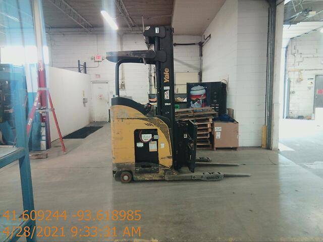 Equipment Description: General Information Model Number NDR035 Manufacturer Yale Type Forklift Subtype Electric Narrow Aisle Single Reach Fuel Type Electric Dimensions Total Weight varies Overall Width approximately 47 inches Overall Length varies based on fork length Wheelbase approximately 61 inches Ground Clearance approximately 3 inches Performance Load Capacity lbs Travel Speed unladen approximately 6 miles per hour Lift Speed unladen approximately 60 feet per minute Lower Speed unladen approximately 90 feet per minute Turning Radius approximately 67 inches Power System Power Source Electric Battery Voltage 36 volts Battery Capacity varies Motor Type AC Brakes Service Brake Electric Parking Brake Automatic Tires Tire Type Cushion Drive Tire Size approximately 13 x 5 5 inches Steer Tire Size approximately 10 x 5 inches Forks Fork Length varies Fork Width approximately 3 9 inches Fork Spread adjustable