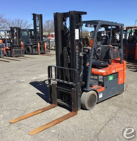 Equipment Description: Model Number 7FBEU20 Manufacturer Toyota Type Forklift Load Capacity lbs Power Source Electric Tire Type Cushion Operator Position Sit-Down Battery Voltage 36V Steering Type Hydraulic Power Steering Number of Wheels 3 Braking System Regenerative and Hydraulic Brakes Length to Fork Face 6 4 ft Overall Width 3 5 ft Height to Top of Overhead Guard 6 5 ft Turning Radius 5 8 ft Travel Speed Unloaded 10 mph Lift Speed Loaded 64 ft min Lowering Speed Loaded 88 ft min Fork Length Varies Fork Width 4 9 inches Fork Thickness 1 6 inches