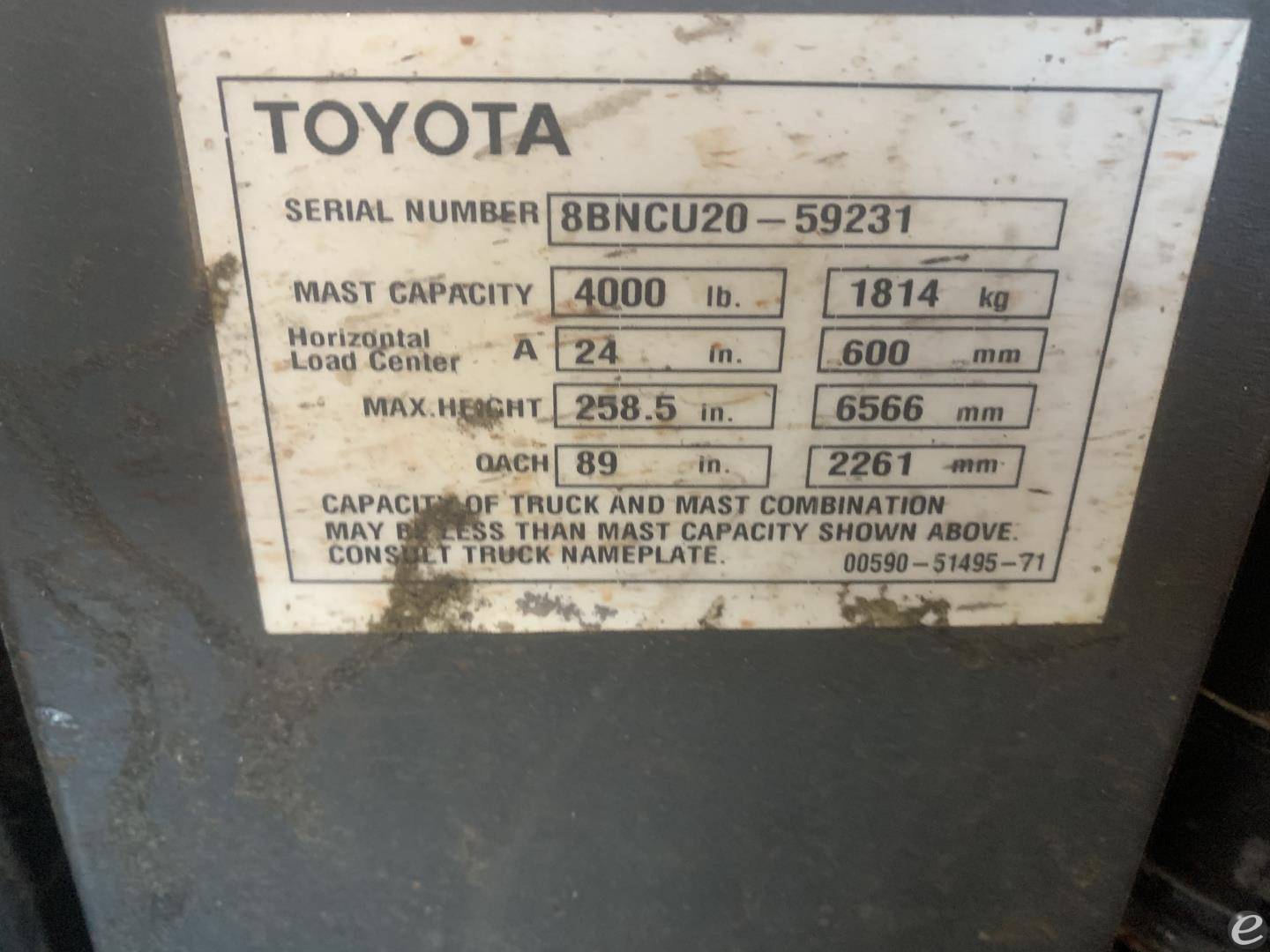 Equipment Description: General Information Manufacturer Toyota Model Number 8BNCU20 Type Forklift Subtype Electric Stand Up End Control Docker Power Type Electric Dimensions Length to Fork Face Approximately 75 inches Overall Width Approximately 42 inches Overall Height cab Approximately 87 inches Weight Overall Weight Including Battery Approximatelylbs Performance Rated Load Capacity lbs Travel Speed Approximately 5 5 mph with load Lift Speed Approximately 55 feet per minute with load Gradeability Approximately 10 with load Tire Information Tire Type Cushion Wheelbase Approximately 56 inches Battery Battery Voltage 36V Battery Capacity ApproximatelyAh Key Features Stand-up control design for efficient handling Advanced regenerative braking system Integrated digital display for easy monitoring AC drive motor for enhanced performance