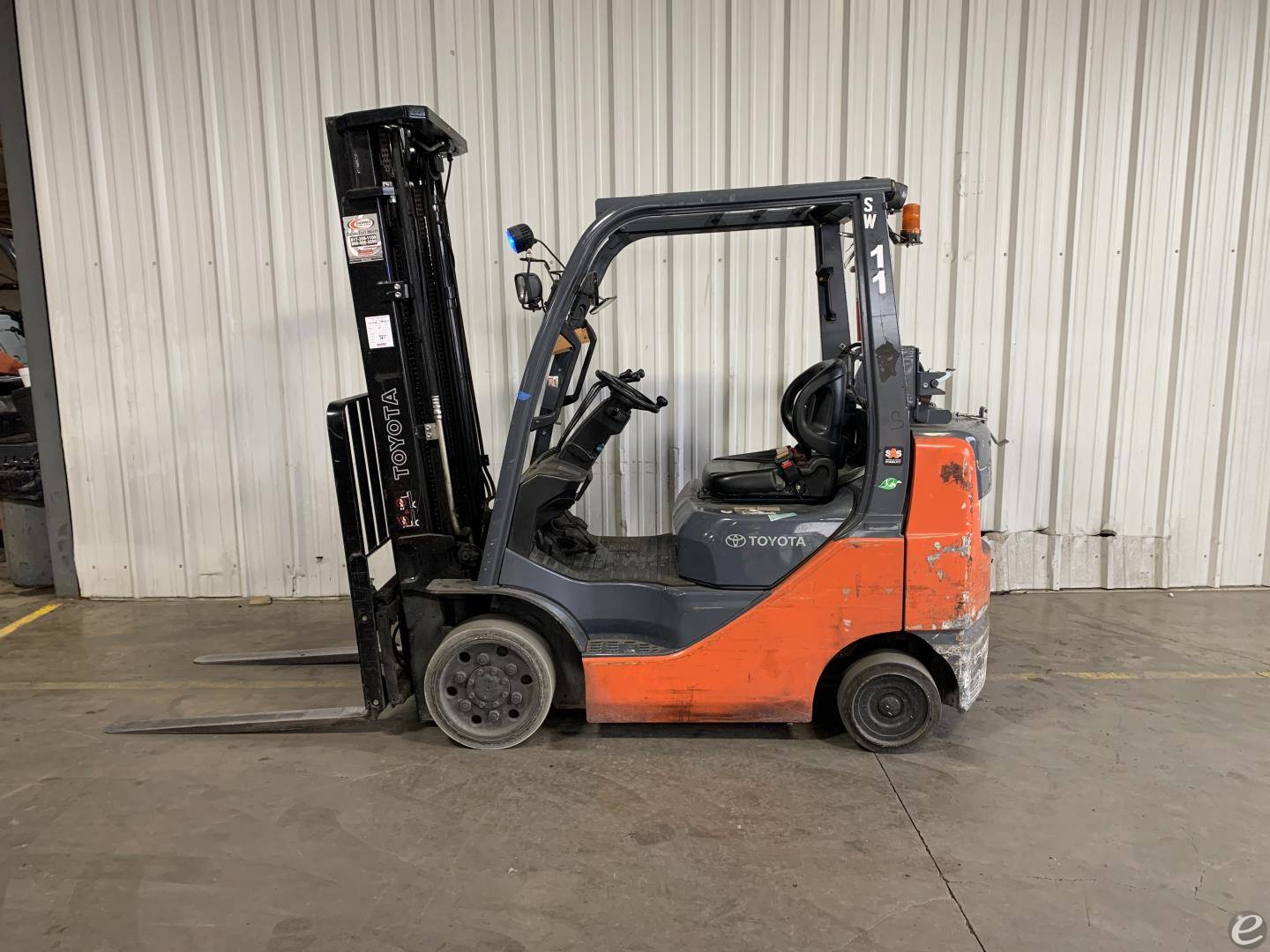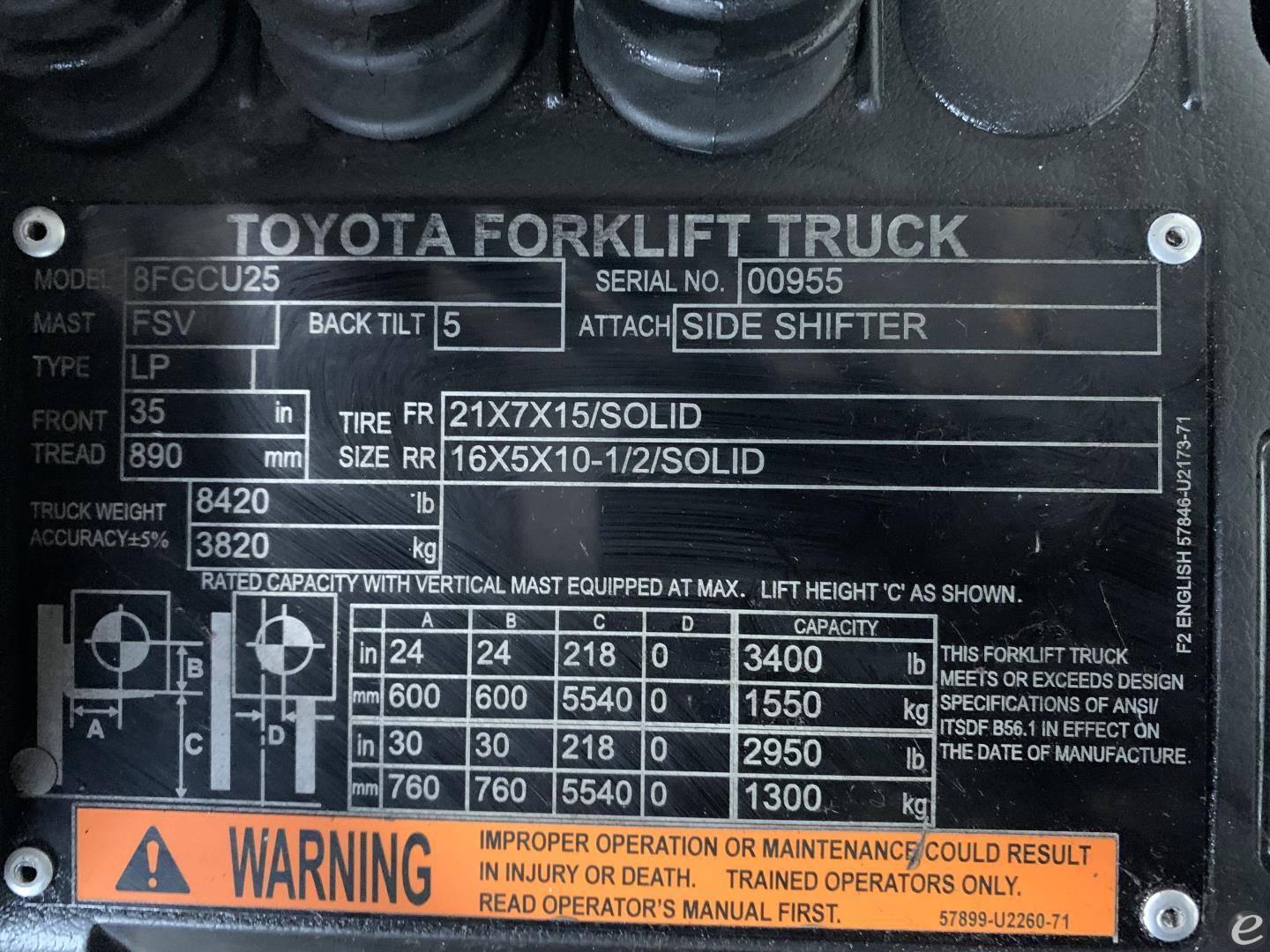 Equipment Description: Manufacturer Toyota Model Number 8FGCU25 General Specifications Power Type LPG Liquid Petroleum Gas Operator Position Sit-down Tire Type Cushion Number of Wheels 4 Dimensions Length to Face of Forks ft Overall Width Without Load 3 5 ft Height to Top of Overhead Guard 7 ft Turning Radius in Minimum Outside Turning Radius 5 5 ft Wheelbase ft Performance Rated Load Capacity lbs Load Center 24 in Travel Speed Loaded mph Travel Speed Unloaded mph Lifting Speed Loaded ft min Lifting Speed Unloaded ft min Lowering Speed Loaded 98 ft min Lowering Speed Unloaded 98 ft min Engine Specifications Engine Model Toyota 4Y Engine Type 4-cylinder water-cooled Displacement in Rated Power 51 hp RPM Torque 6 lbf ft RPM Weights Service Weight lbs Axle Loading Front lbs With Load Axle Loading Rear lbs With Load Wheel Specifications Front Tires 21x7x15 Rear Tires 16x5x10 Tread Front Rear 36 36 in Transmission Transmission Type Powershift Number of Speeds Forward Reverse 1 1 Brakes Service Brake Hydraulic Parking Brake Mechanical hand operated