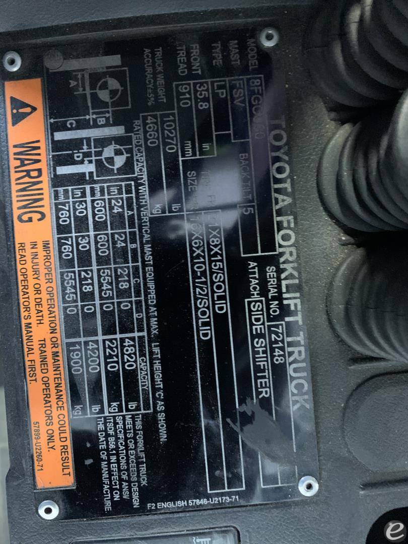 Equipment Description: Engine and Powertrain Engine Manufacturer Toyota Engine Type 4Y-ECS Fuel Type LPG Horsepower Approximately 51 HP Number of Cylinders 4 Dimensions and Weight Overall Length Approximately 94 inches without forks Overall Width Approximately 45 inches Overall Height to top of overhead guard Approximately 83 inches Wheelbase Approximately 63 inches Weight Approximatelylbs Performance Load Capacity lbs Travel Speed Approximately 11 mph Lift Speed Approximately 98 feet per minute unladen Gradeability 27 laden Chassis and Body Tire Type Cushion Steering Hydrostatic Power Steering Brakes Hydraulic Operator Compartment Seat Adjustable with seat belt Instruments Multifunction display Safety Features System of Active Stability SAS Operator Presence Sensing System OPSS