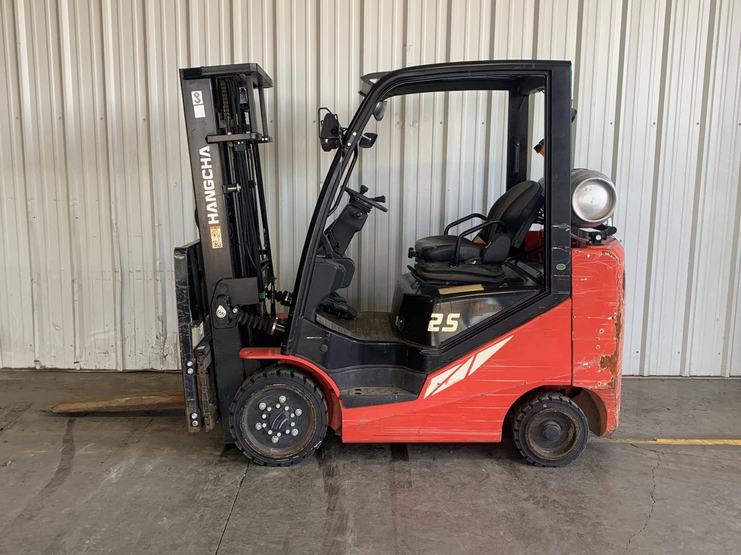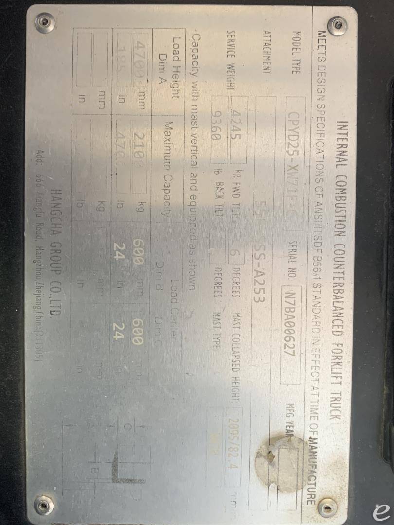 Equipment Description: General Information Model Number FP25C Manufacturer Hangcha Type Forklift Subtype Cushion Tire 4 Wheel Sit Down Indoor Warehouse Fuel Type LP Gas Dimensions Overall Length Approximately 95 inches varies with fork length Overall Width Approximately 42 inches Overall Height Overhead Guard Approximately 83 inches Wheelbase Approximately 58 inches Ground Clearance Approximately 3 5 inches Powertrain Engine Type Internal Combustion Engine Fuel System LP Gas Transmission Type Powershift Performance Load Capacity lbs Travel Speed Loaded Unloaded Approximately 11 12 mph Gradeability Loaded Approximately 20 Wheels and Tires Tire Type Cushion Number of Wheels 4 Brakes Service Brake Hydraulic Parking Brake Manual Mechanical Operator Environment Seat Adjustable Steering Power Steering