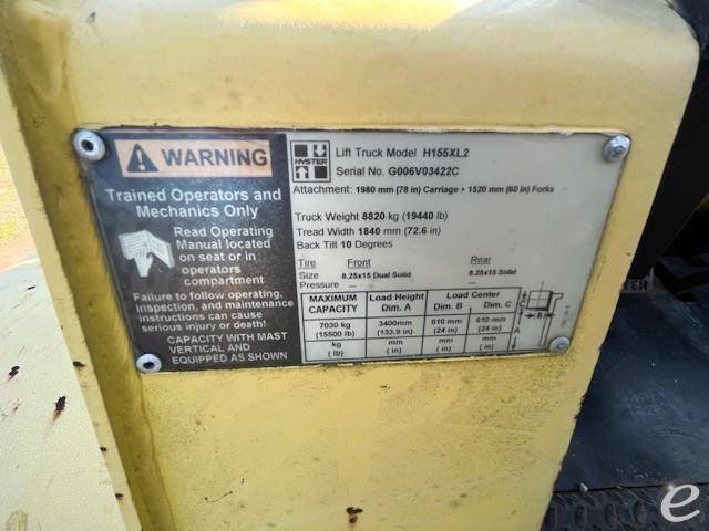 Equipment Description: Hyster H155XL2 15 500 Capacity 2-Stage Mast 133 Lift Height Side-Shift 96 Forks LPG Engine 4 3L GM Solid Tires