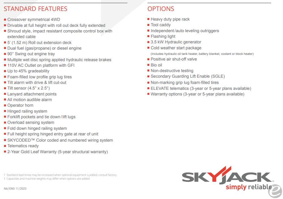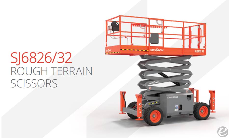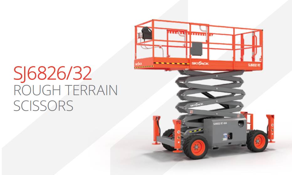 Equipment Description: New SkyJack SJ6832 RT Rough Terrain Scissor Lift with dual fuel gas propane or diesel 38 work height 69 5 overall width 107 overall length 69 99 stowed height railings down up 5 rolling extension deck 8 of ground clearance 40 gradeability 60 inside turning radius 156 outside turning radius 39 seconds lift speed operable at full height overall capacity 4 person operator up to 28 mph winds HP Kubota diesel engine outriggers for stability solid rough terrain tires 110v AC work outlet with GFI wet disc brake system crossover symmetrical 4WD plus a beautiful finish STOCK PHOTOS