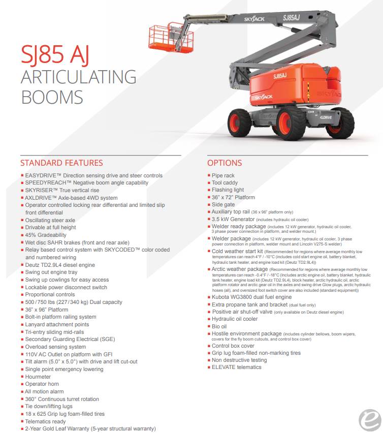 Equipment Description: New SkyJack SJ85 AJ Articulating Boom Lift with 91 of working height 56 horizontal reach 34 up and over height 36 x96 platform size 2 19 tail swing 8 2 stowed width 8 9 transport height 38 2 stowed length 32 11 transport length 5 6 jib length 500 750 lb Capacity Deutz TD2 9L - 74 HP diesel engine 110volt AC work outlet with GFI foam filled all terrain tires operator controlled locking rear differential and limited slip front differential plus a beautiful finish STOCK PHOTOS